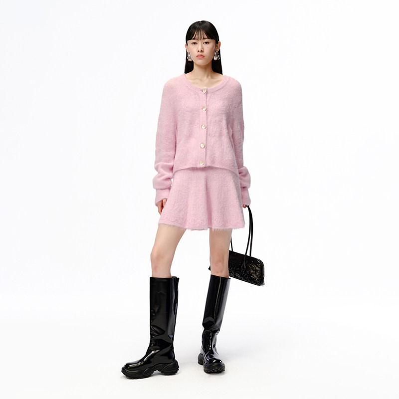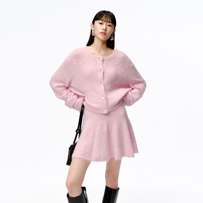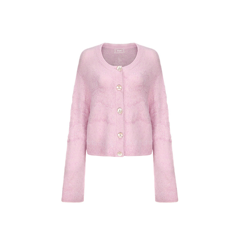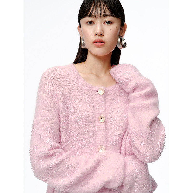 XIAOLI筱李 秋冬新品粉色慕斯重工钉珠羊驼毛长袖针织短开衫
