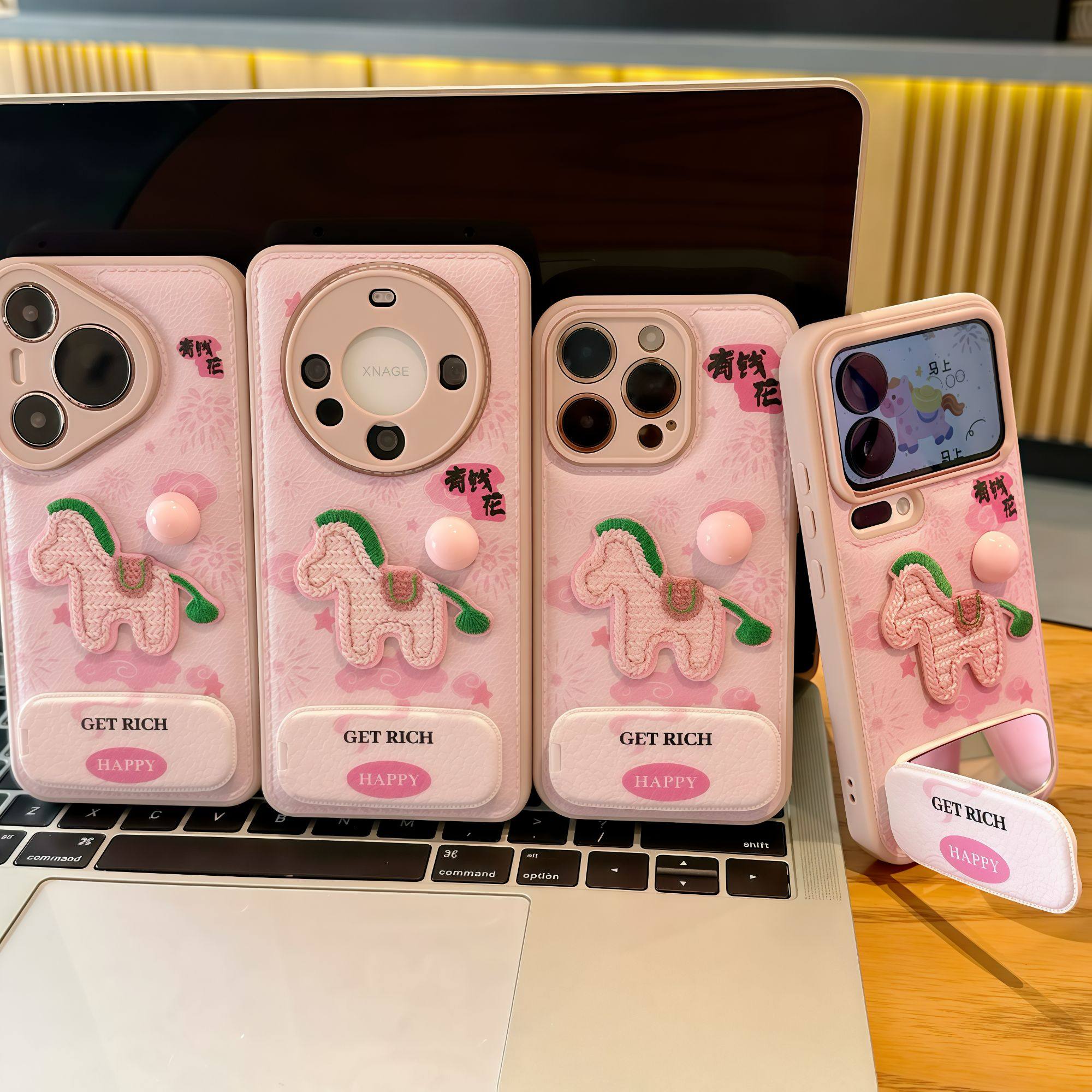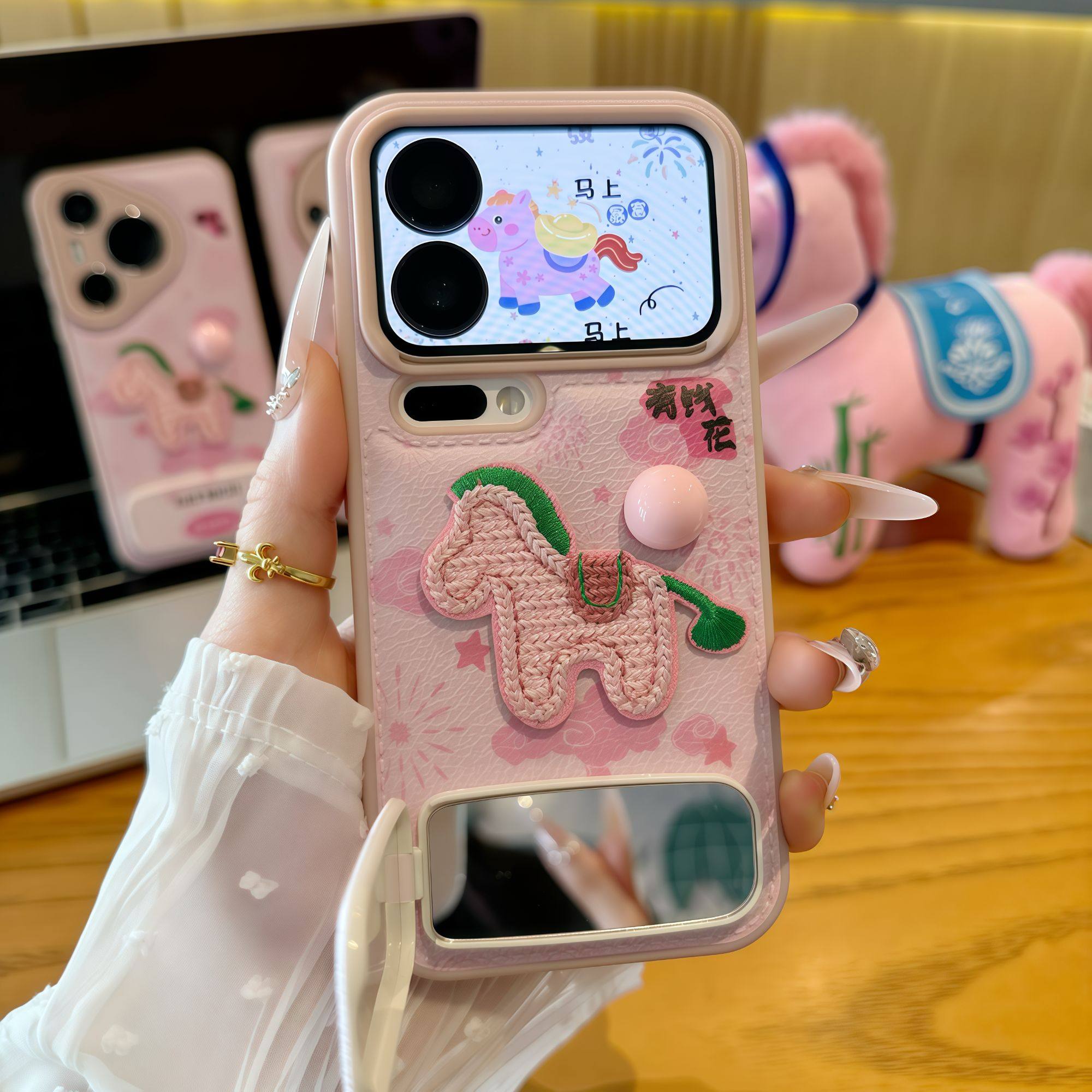 有钱花粉马适用苹果17promax手机壳16华为mate70新款镜面支架pura70糖果气垫壳OPPOReno13/vivos20小米15刺绣