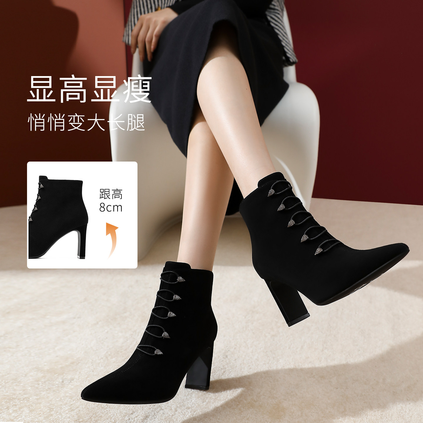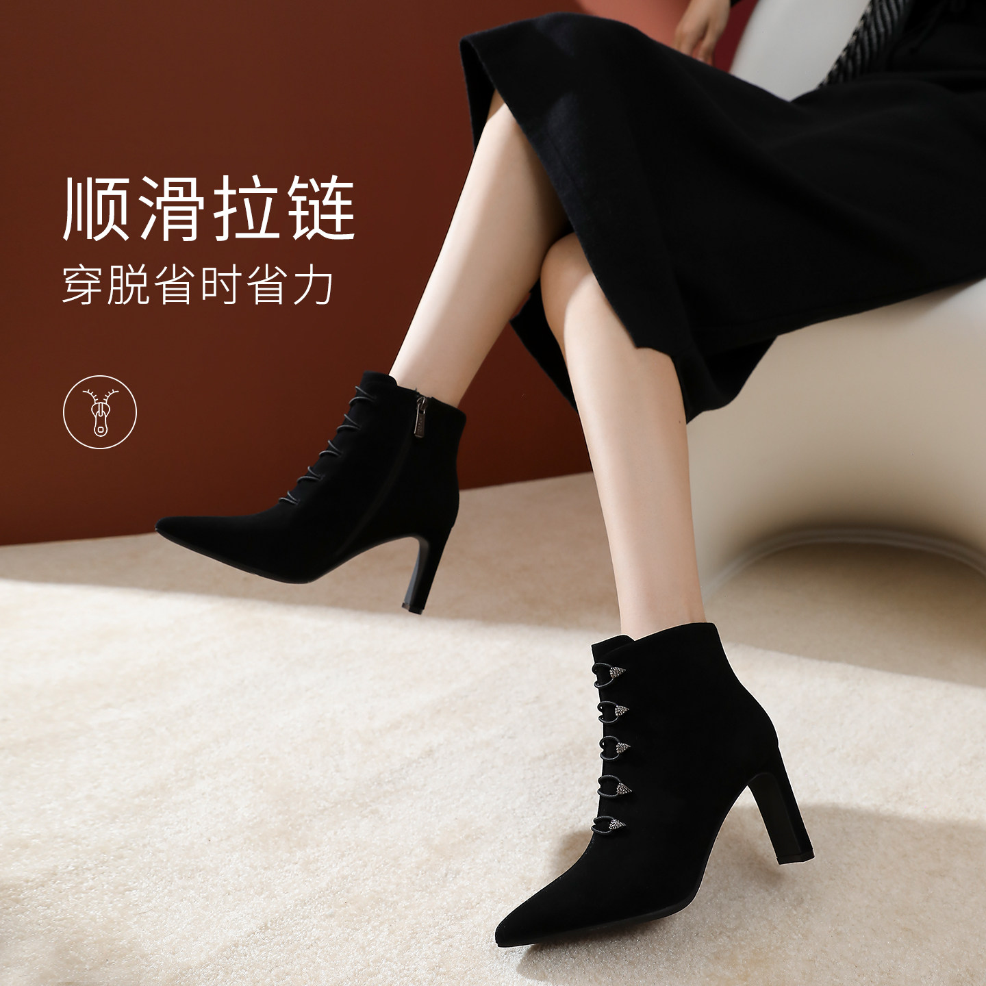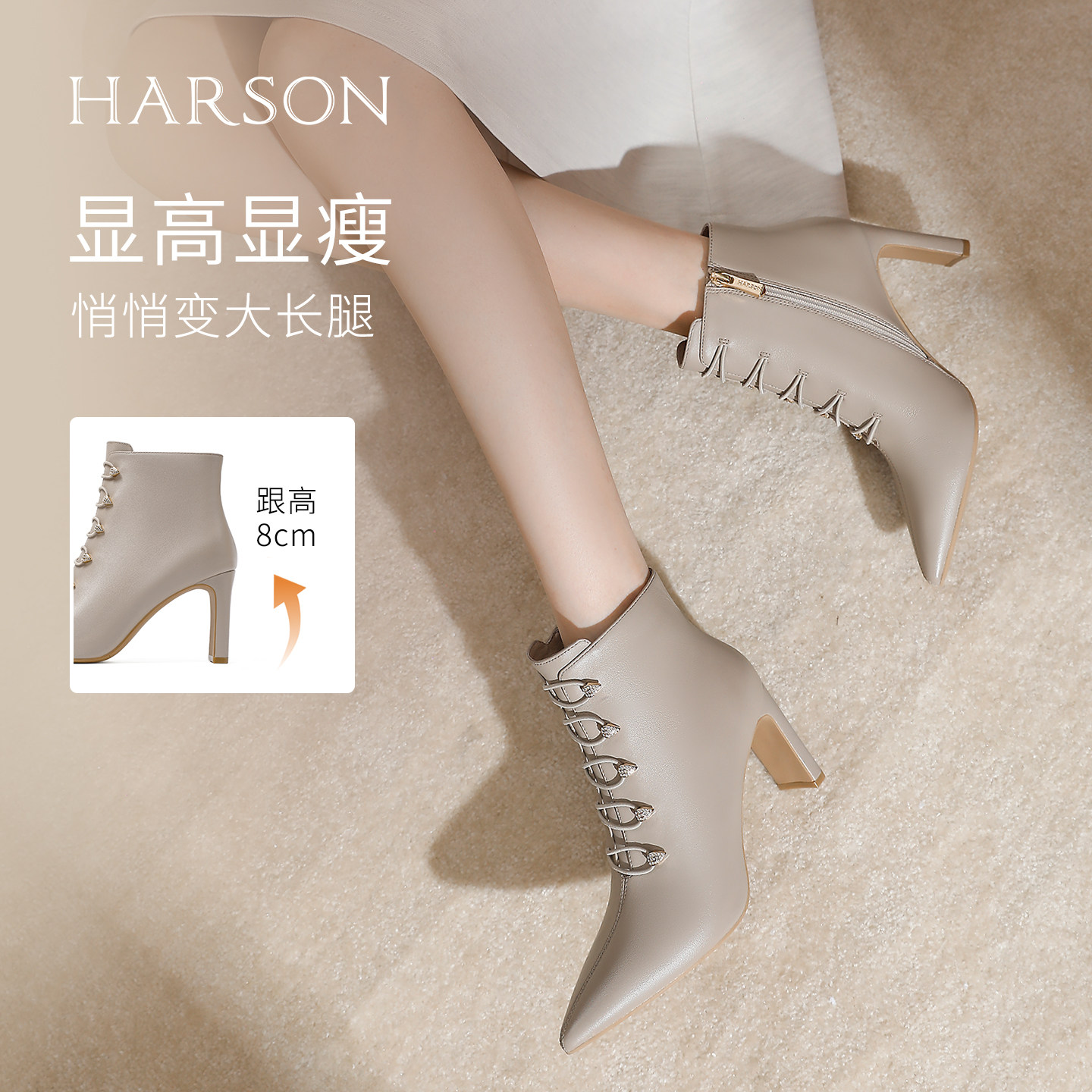 哈森小羊皮高跟女靴冬季新款气质尖头时装短靴踝靴HA246013