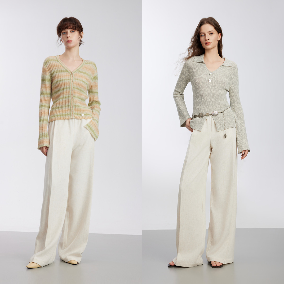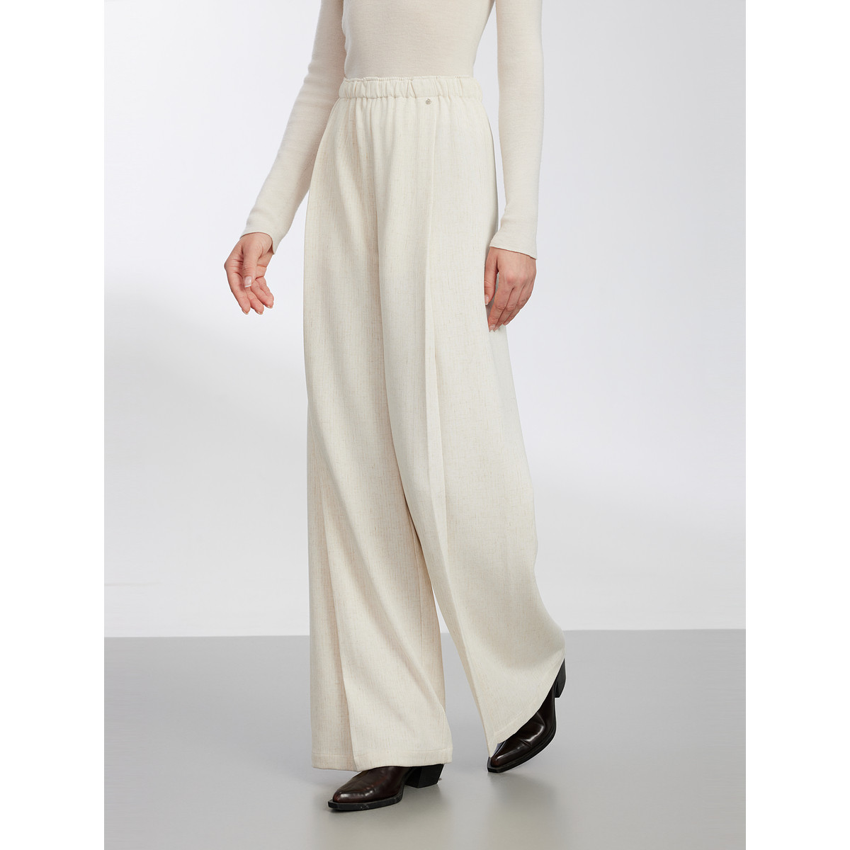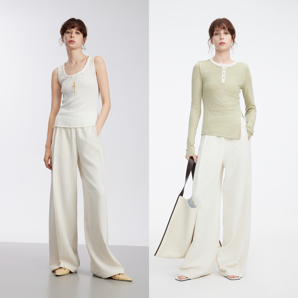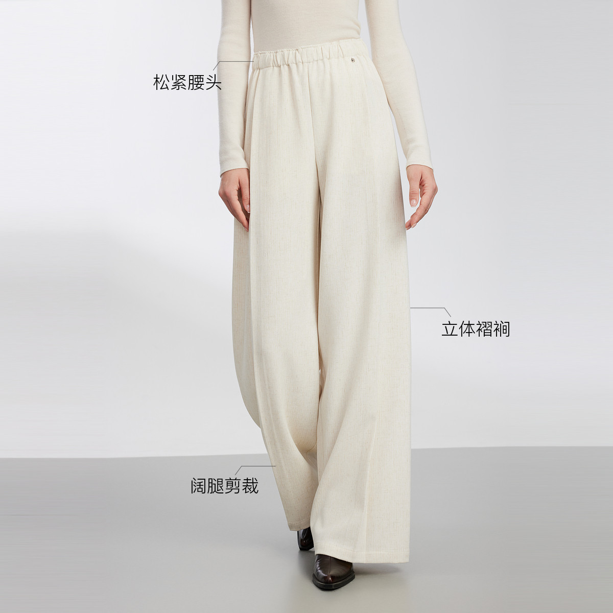 ELLE米白色亚麻松紧腰显瘦休闲裤女2025秋新款小个子垂坠感直筒裤