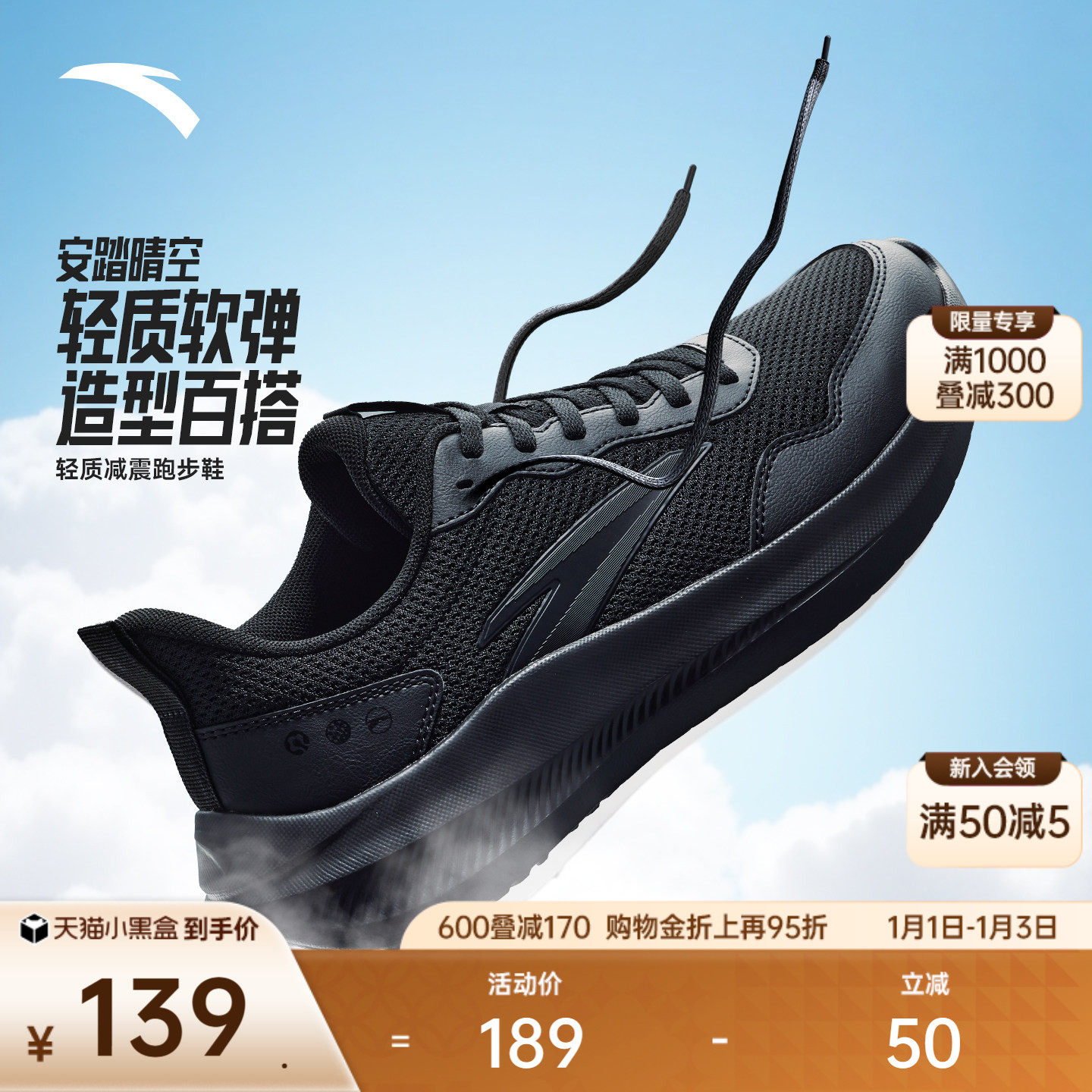安踏晴空丨冬季减震黑色皮面男子跑步鞋耐磨跑鞋轻便通勤运动鞋