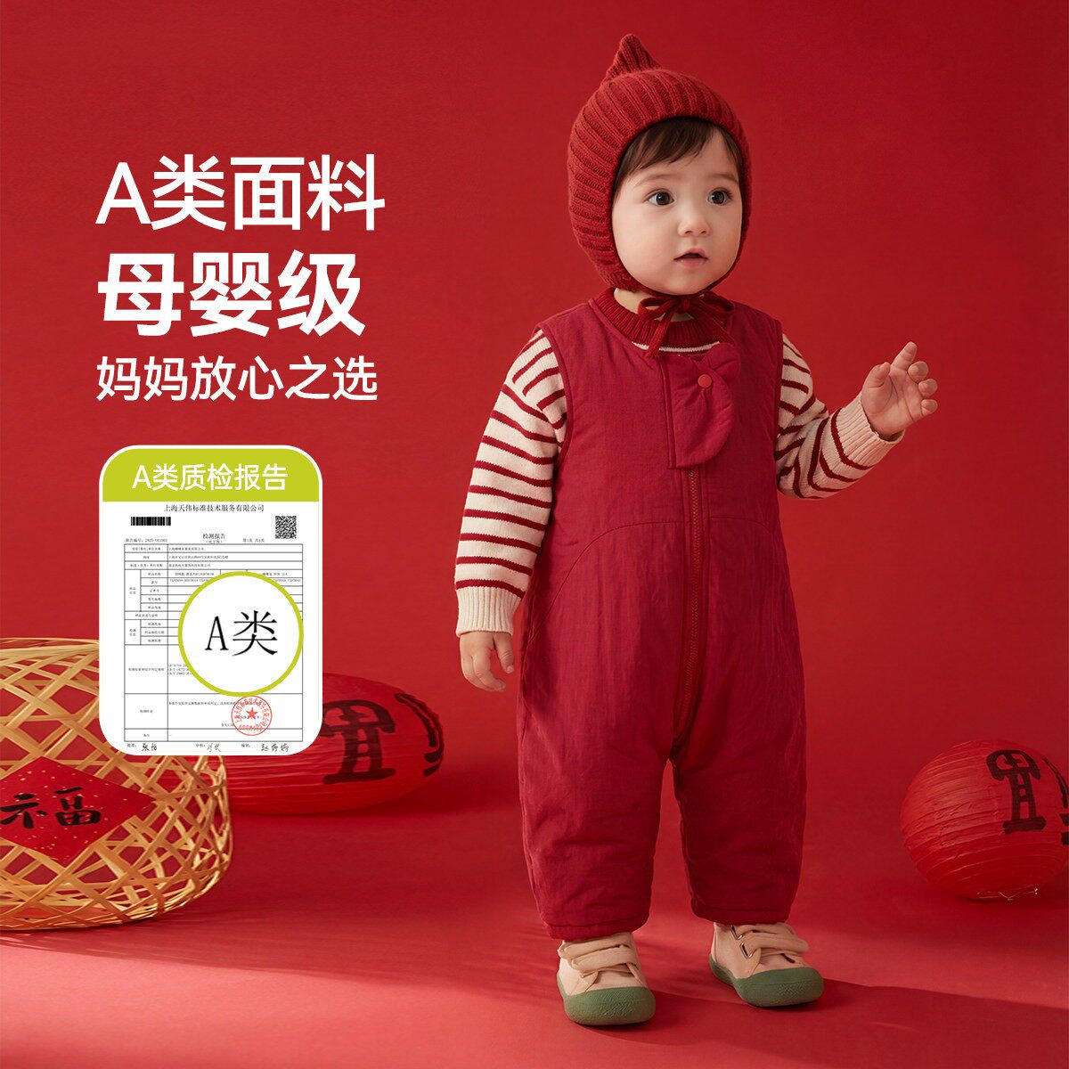 dudujia宝宝背带裤冬装男童年装女童裤子洋气儿童连体衣红色冬季