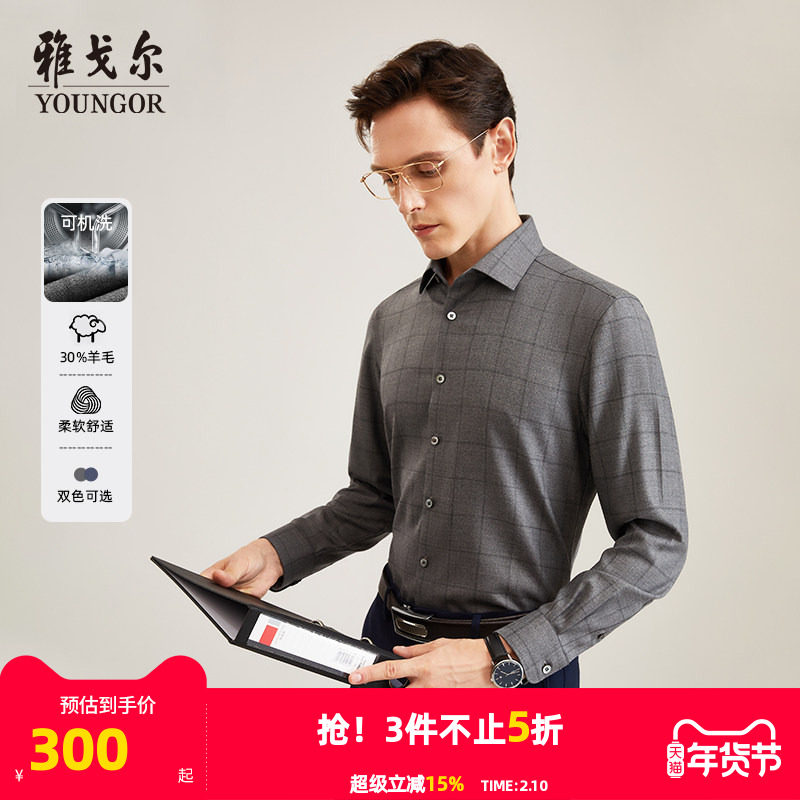 【30%羊毛可机洗】雅戈尔春秋新款商务保暖易打理格纹长袖衬衫男