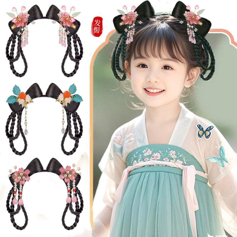 儿童汉服假发蝴蝶结发髻造型古装假发包女童汉服假发头饰假发古风