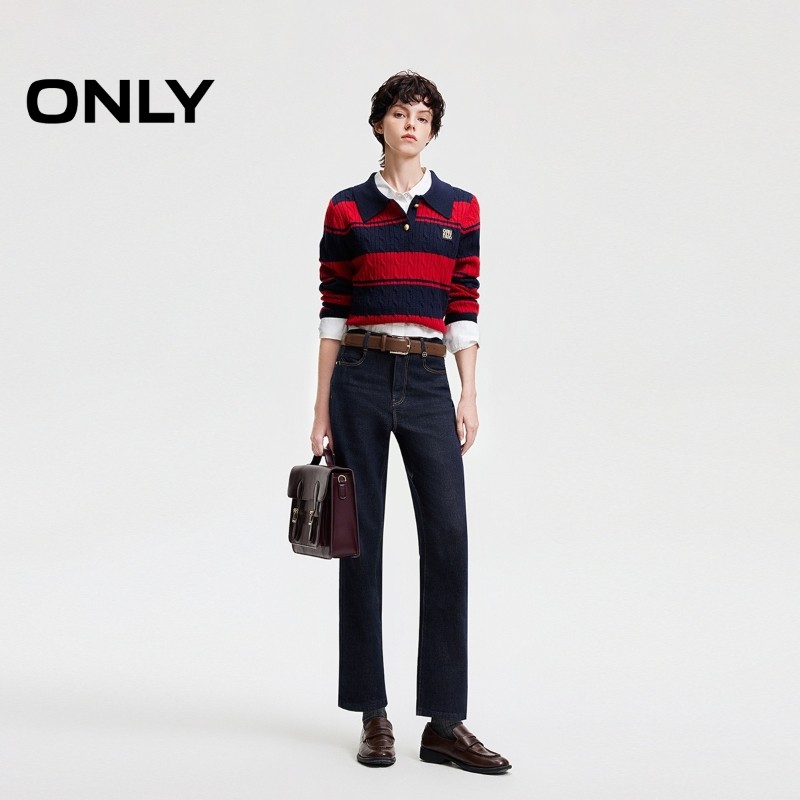 ONLY2025冬季新款含羊毛航海系学院风条纹翻领宽松毛衣针织衫女