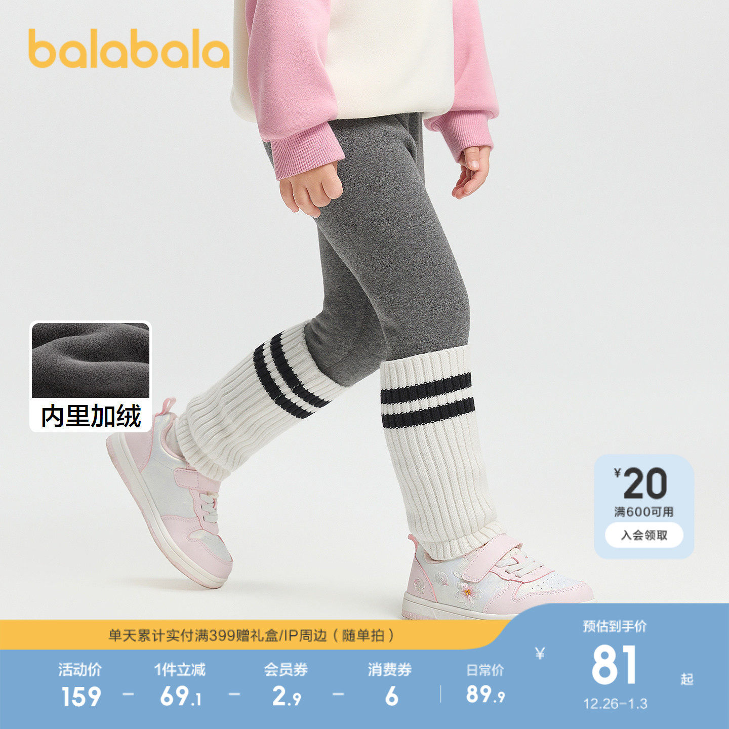 【balaOne】巴拉巴拉童装儿童加绒打底裤子女童2025秋冬新款拼接