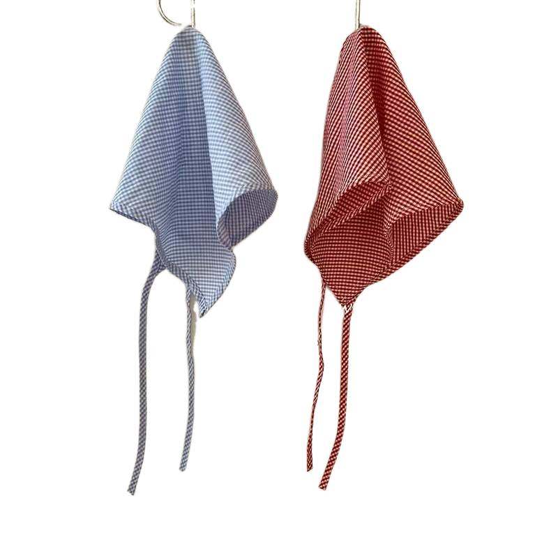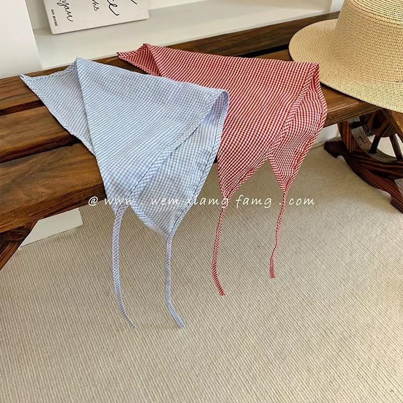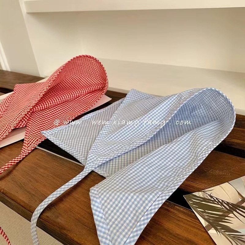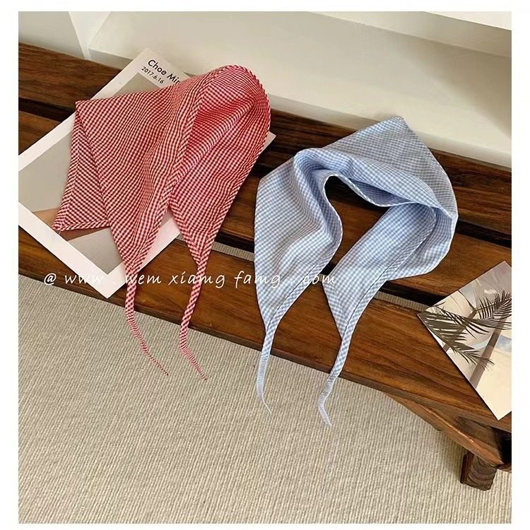 法式头巾蓝色格子三角巾包头绑发丝巾女ins春秋装饰格子发带