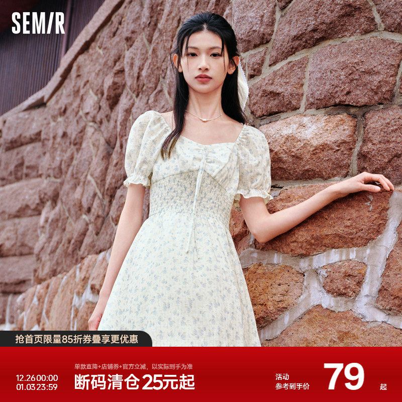 森马连衣裙女荷叶边雪纺短裙2024夏季新款方领收腰肌理碎花裙浪漫