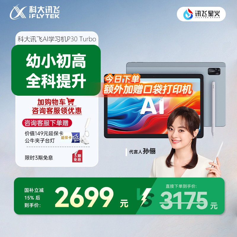 【全国补立减15%】科大讯飞AI学习机P30Turbo小初高智能学生平板一年级高中学习机英语学习机