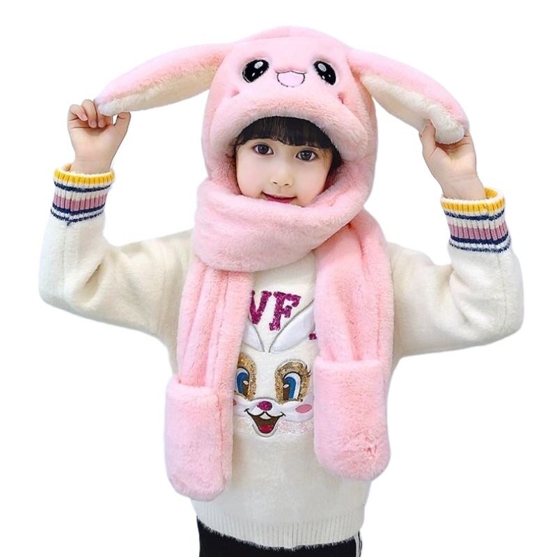 儿童帽子围巾一体兔耳朵会动手套秋冬季男女童宝宝加厚可爱三件套