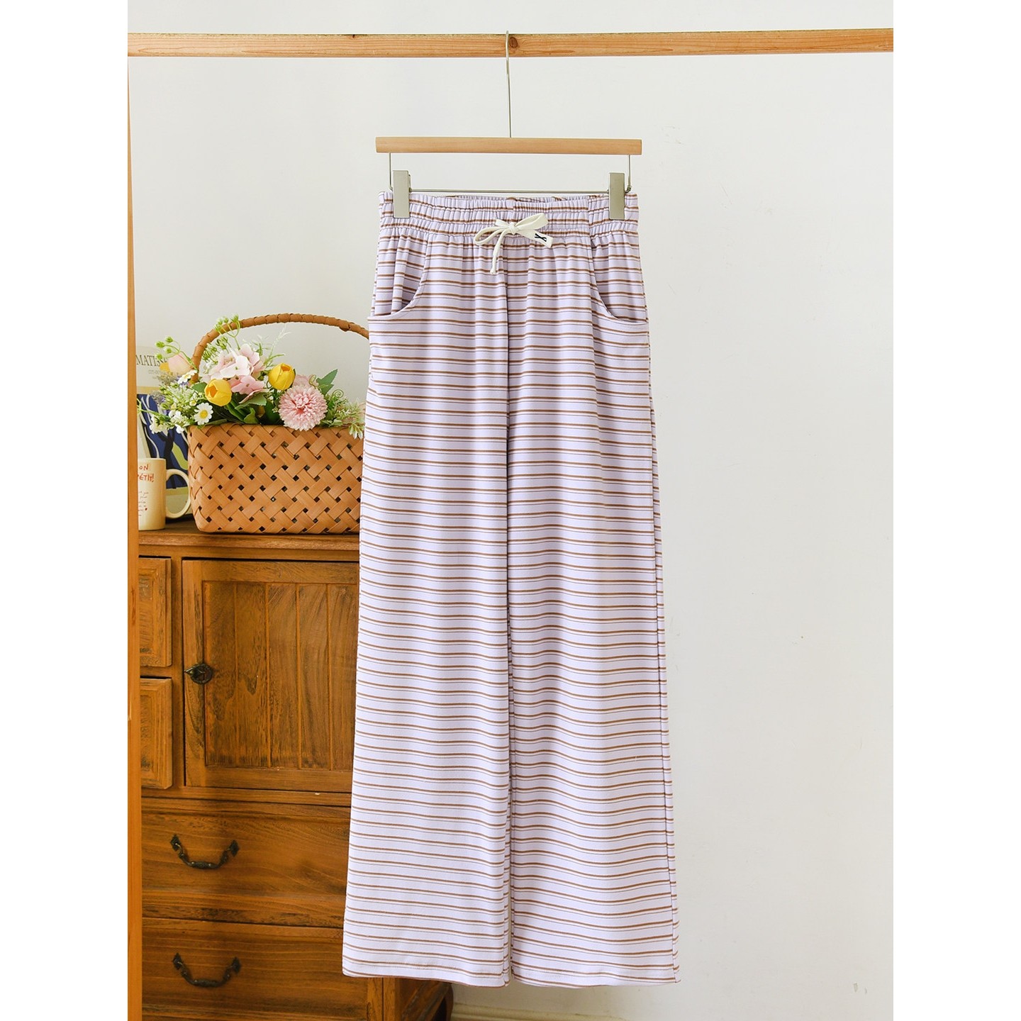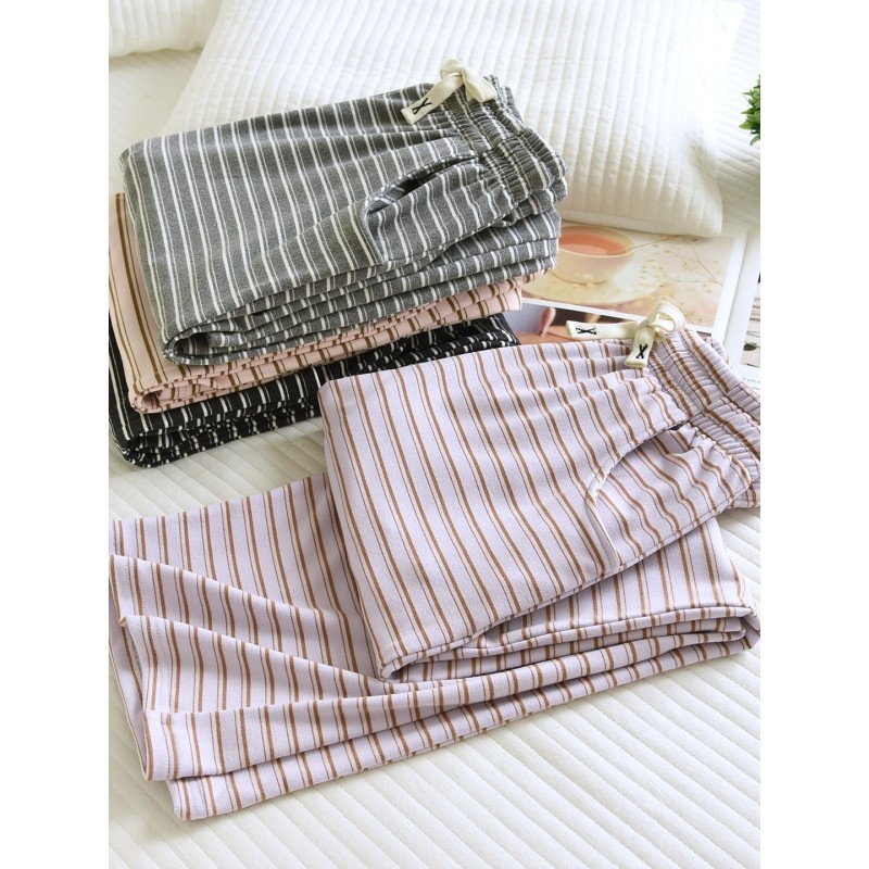 红豆条纹睡裤女秋冬保暖长裤德绒加厚带口袋2025新款薄冬天直筒家