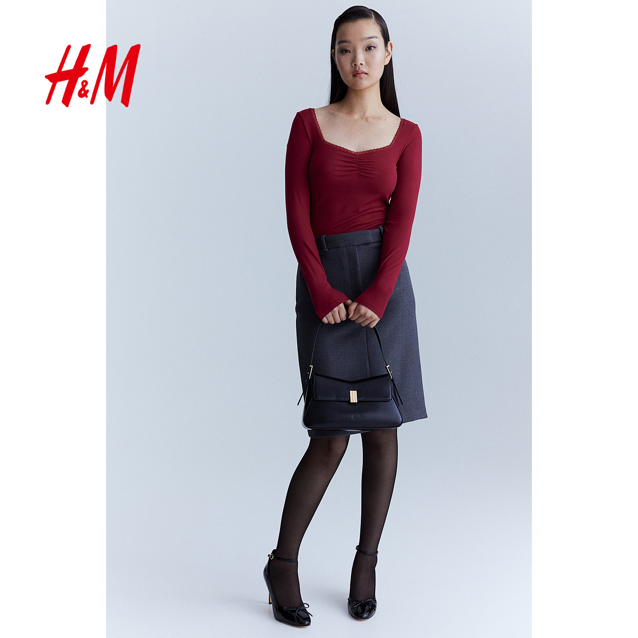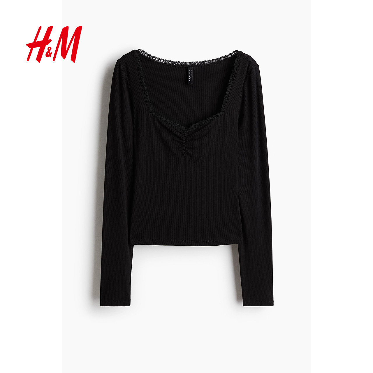 HM女装T恤冬季气质简约休闲蕾丝边罗纹上衣1266159