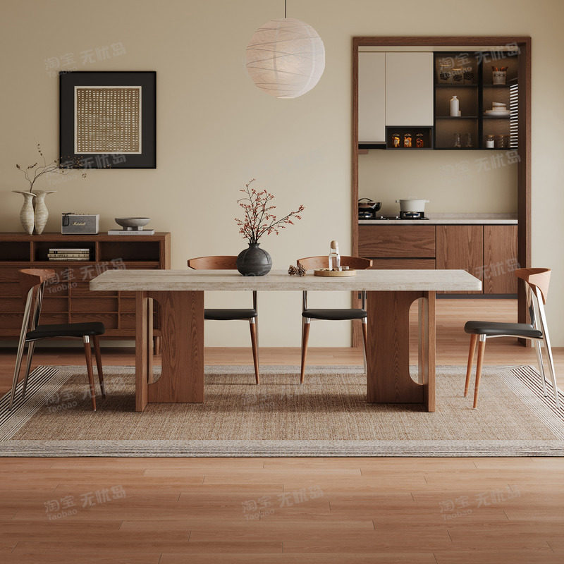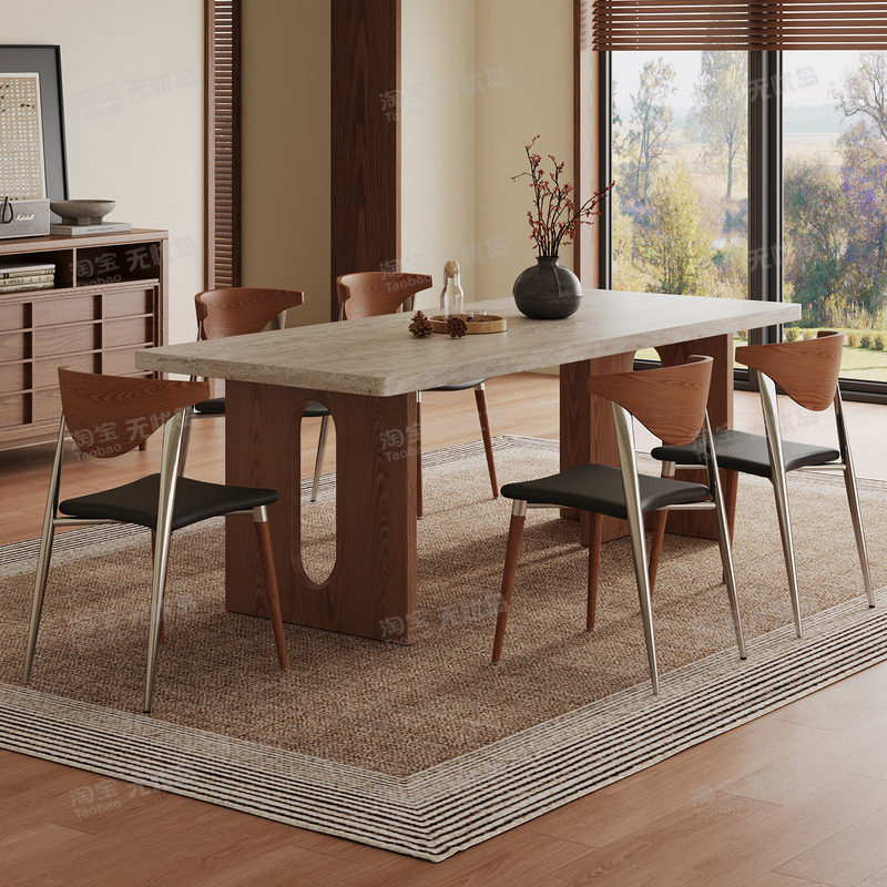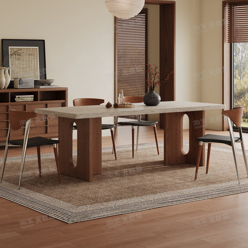 长方形法式复古下挂洞石岩板餐桌中古风设计师家用岩板实木餐桌