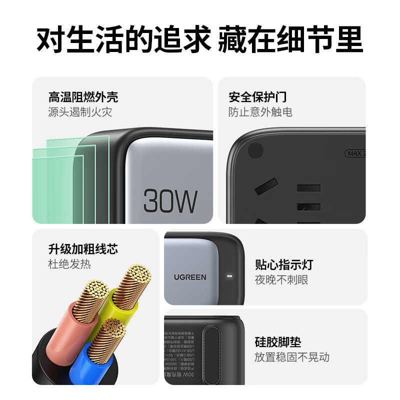 绿联插线板30WPD充电器65W排插插座100W多功能usb智能桌面接线板