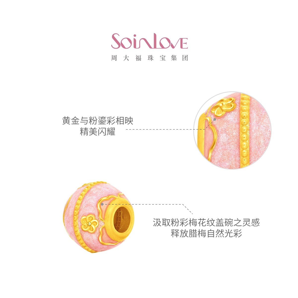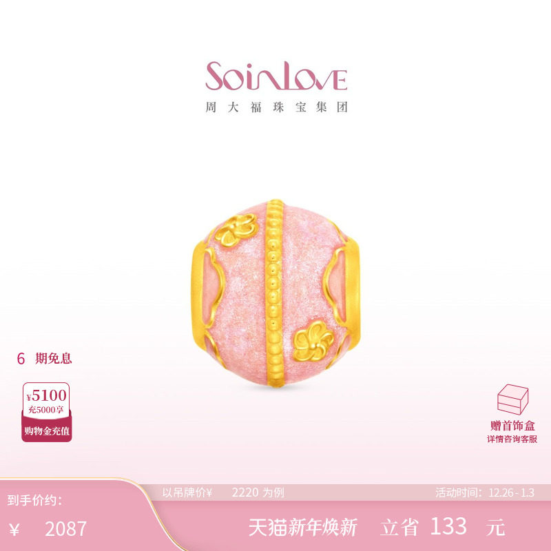 周大福SOINLOVE 蜜粉金十里红妆粉彩香梅黄金转运珠配绳VR1721