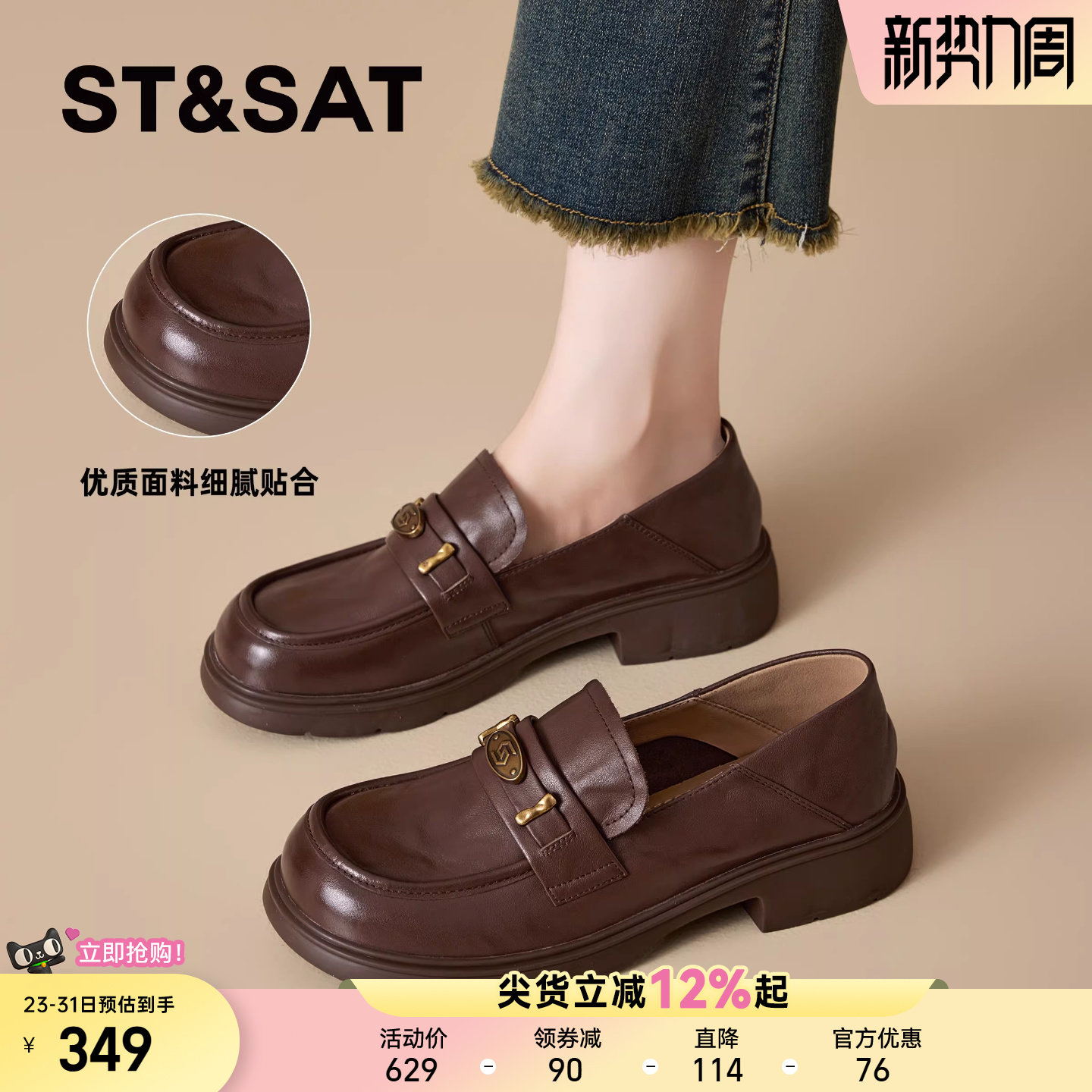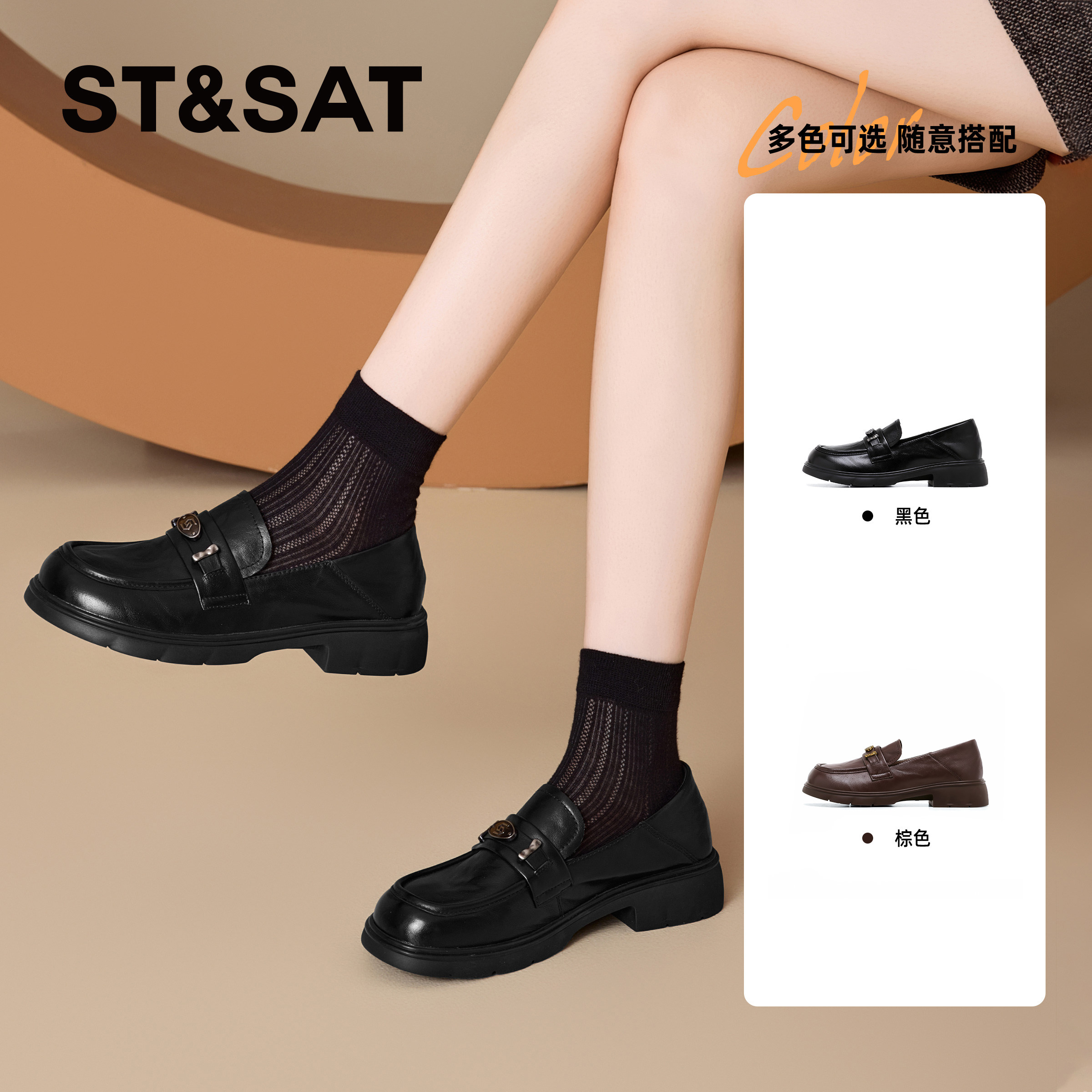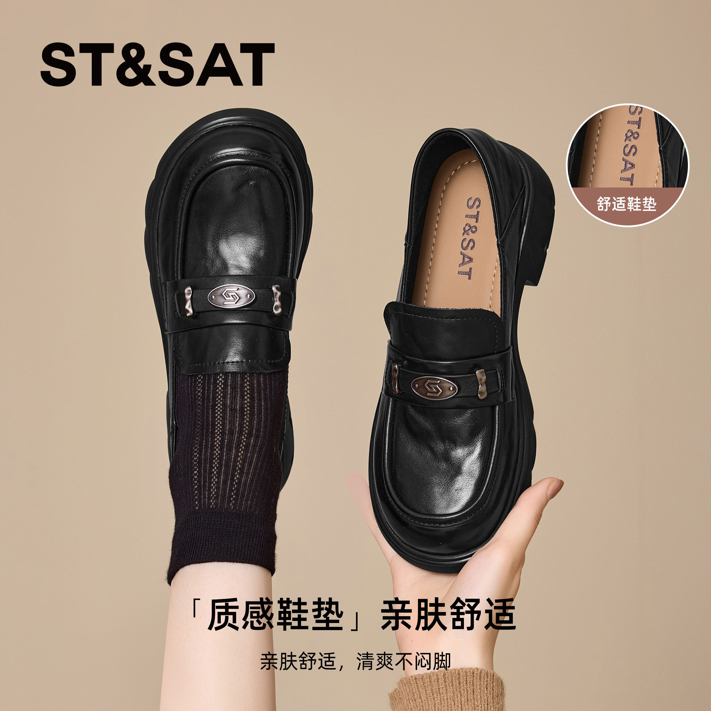 【牛皮】星期六厚底乐福鞋女春秋季黑色增高单鞋子粗跟真皮小皮鞋