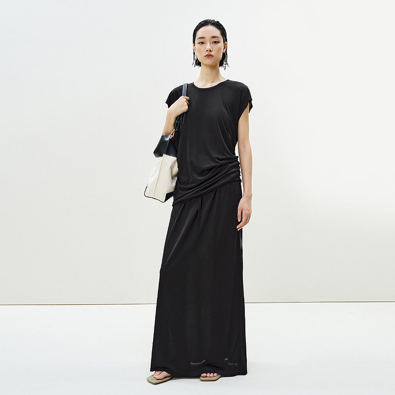 LESS夏季桑蚕真丝T恤女一字领抽褶软垂气质显瘦包袖上衣2P4110140