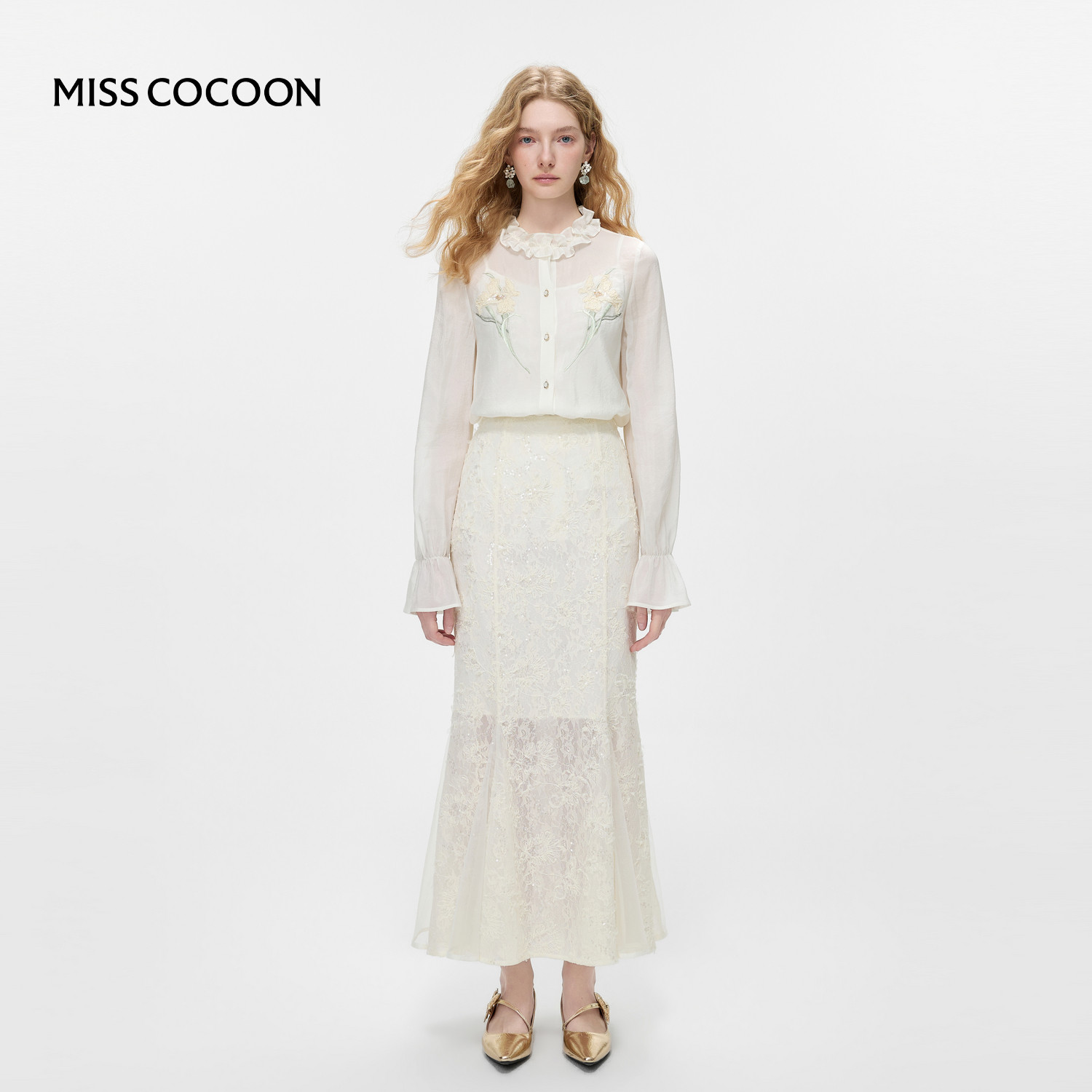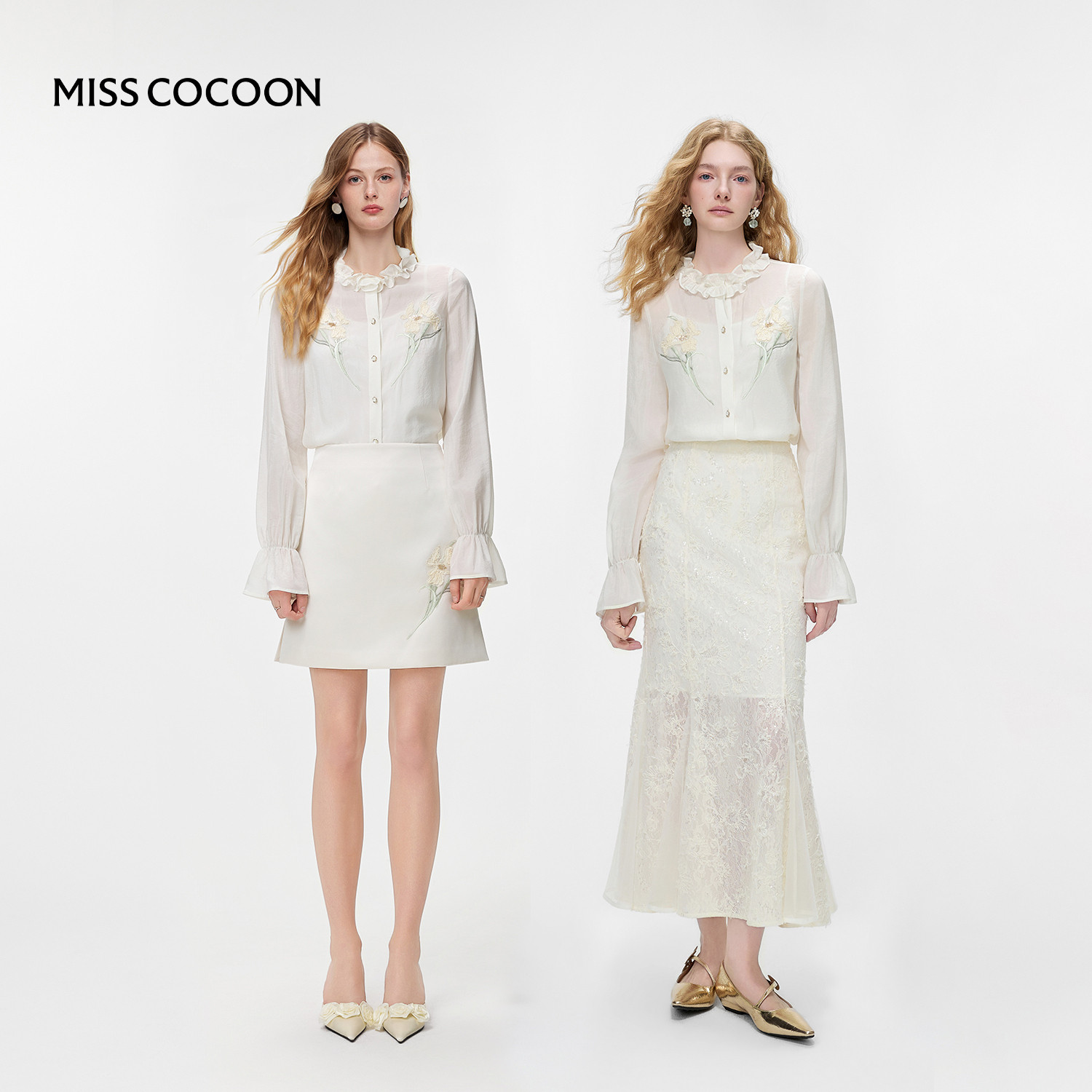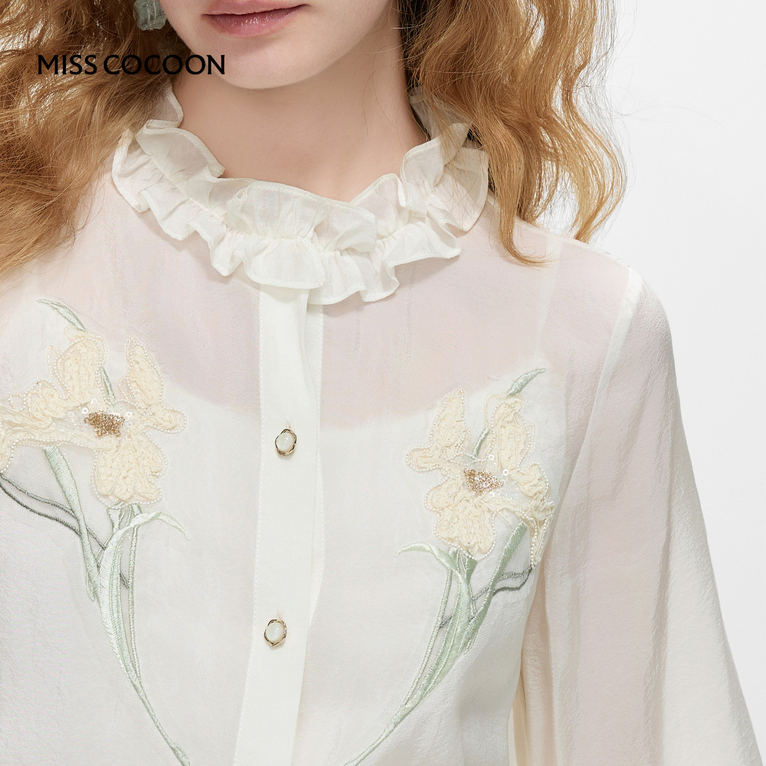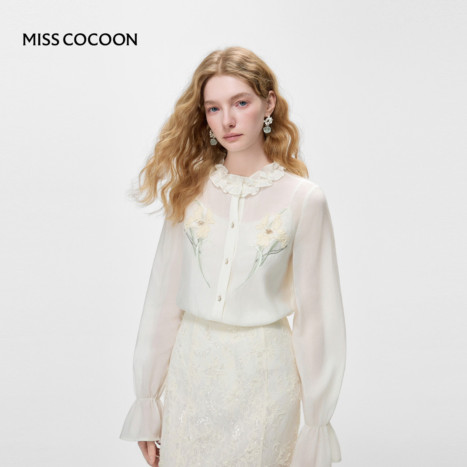 MISSCOCOON可可尼荷叶边雪纺衫女2026春季新款新中式盘花刺绣上衣