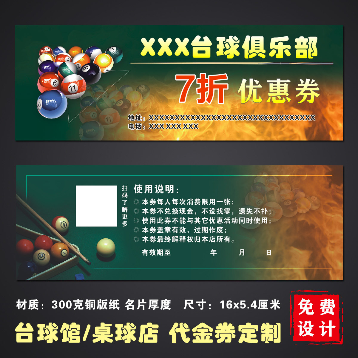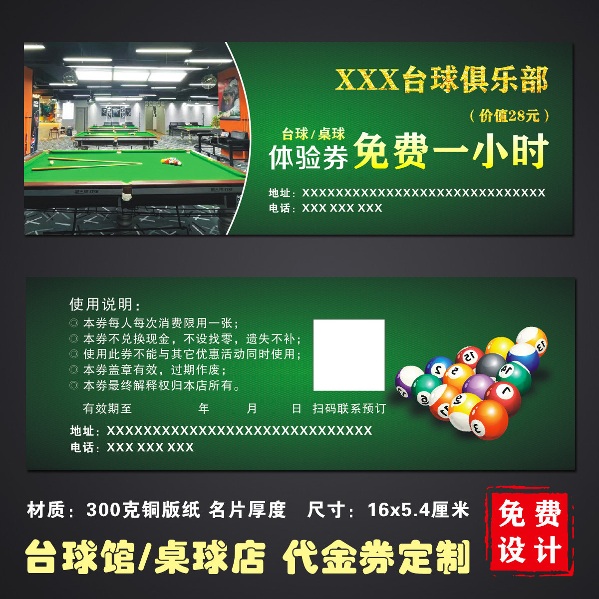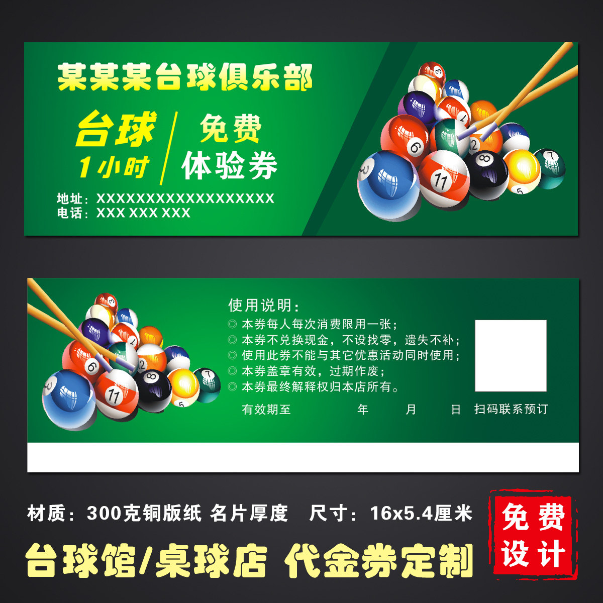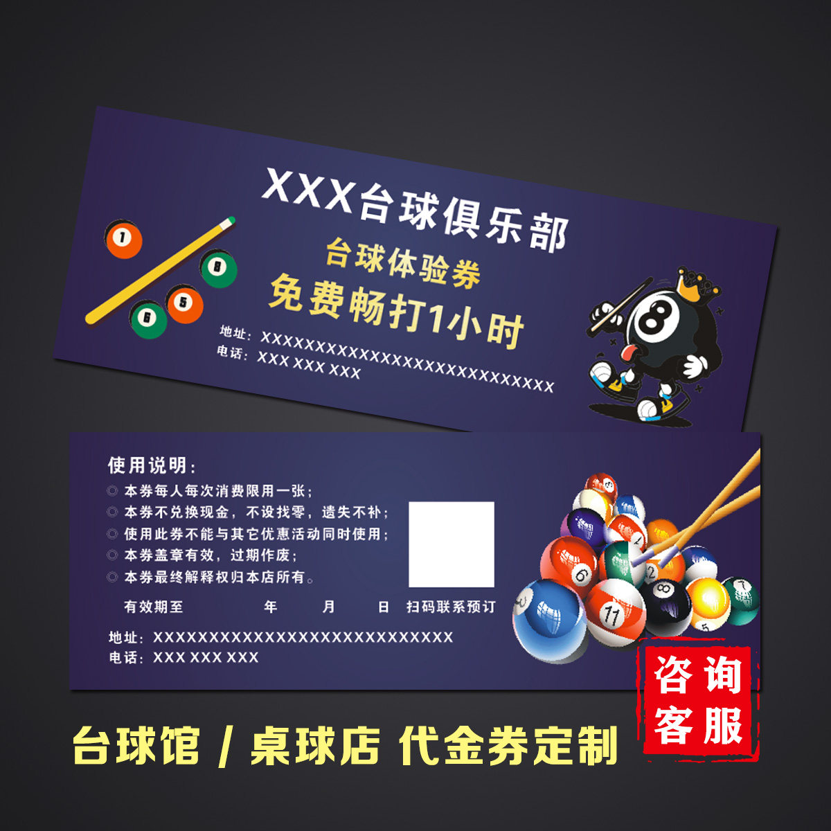 定制桌球店代金券制作台球厅俱乐部现金券设计体验券优惠券抵用券