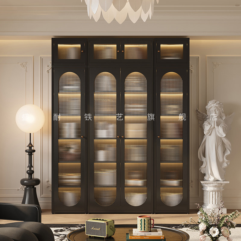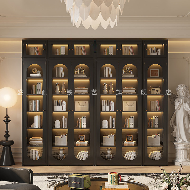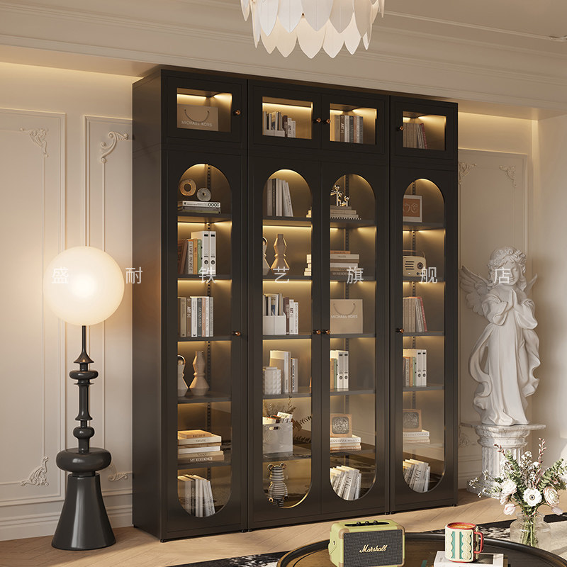 书柜玻璃门法式复古风客厅防尘落地储物柜铁艺简约卧室收纳展示柜