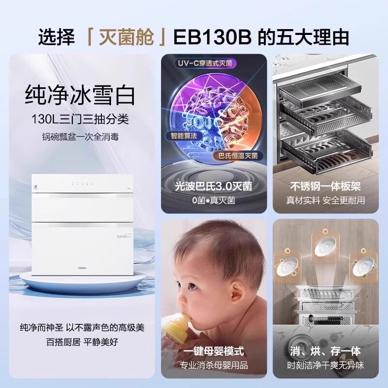 海尔新款130升小红花灭菌舱消毒柜嵌入式家用消毒碗柜厨房EB130B