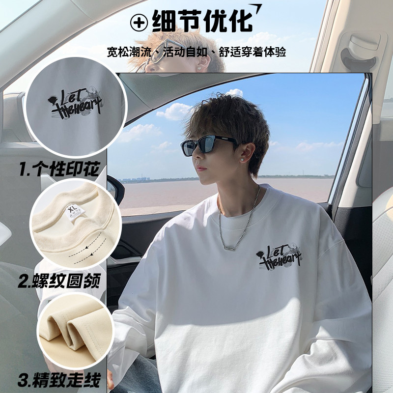 长袖t恤男2025新款春秋季纯棉白色打底衫圆领宽松美式潮牌上衣