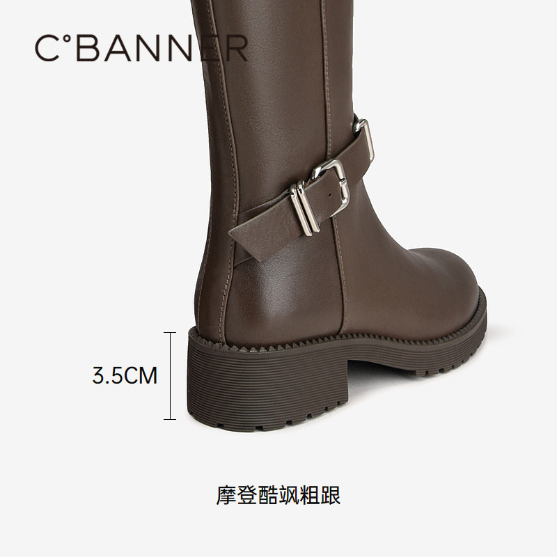潼潼TONG毒液靴皮带扣高筒骑士靴2025新款真皮复古粗跟厚底机车靴