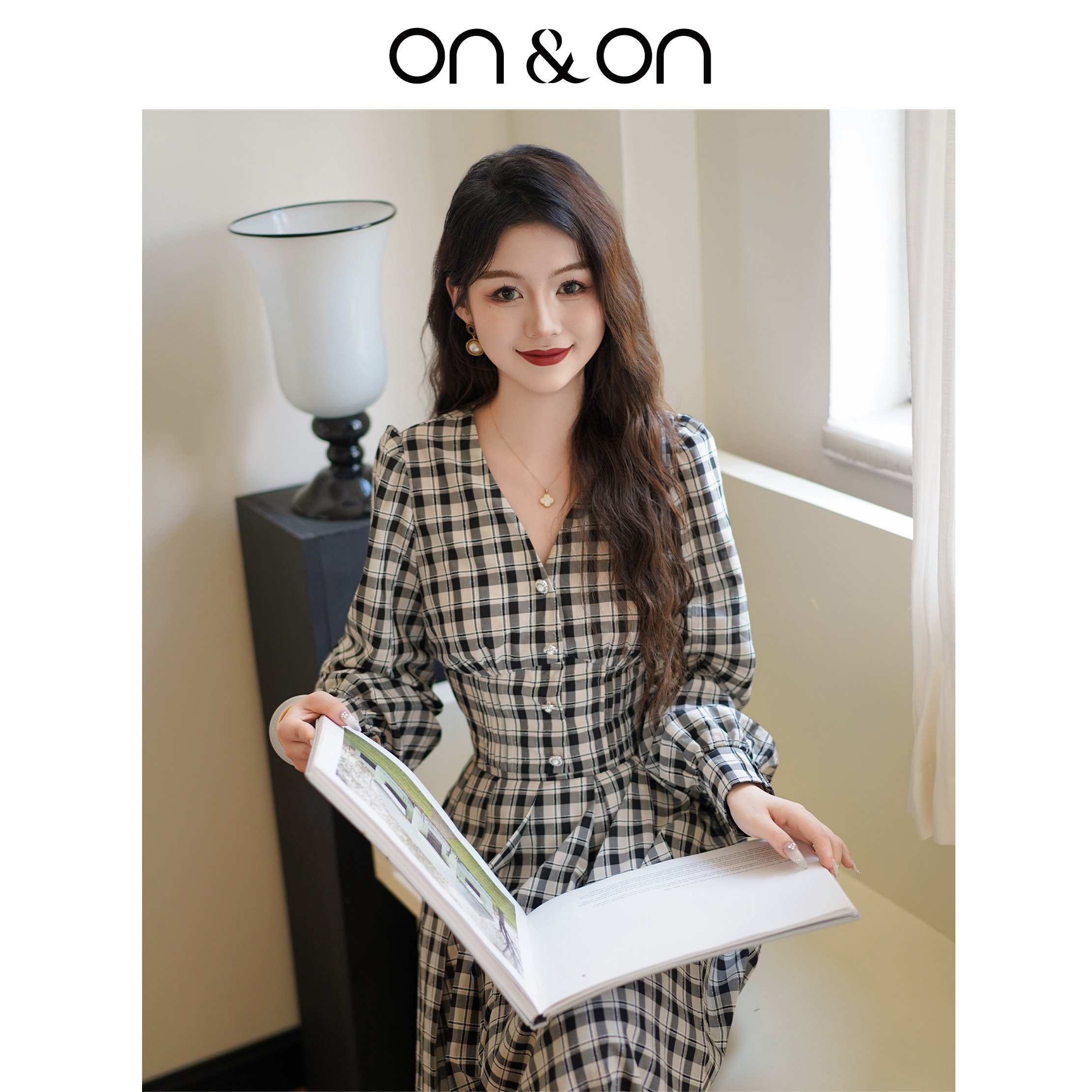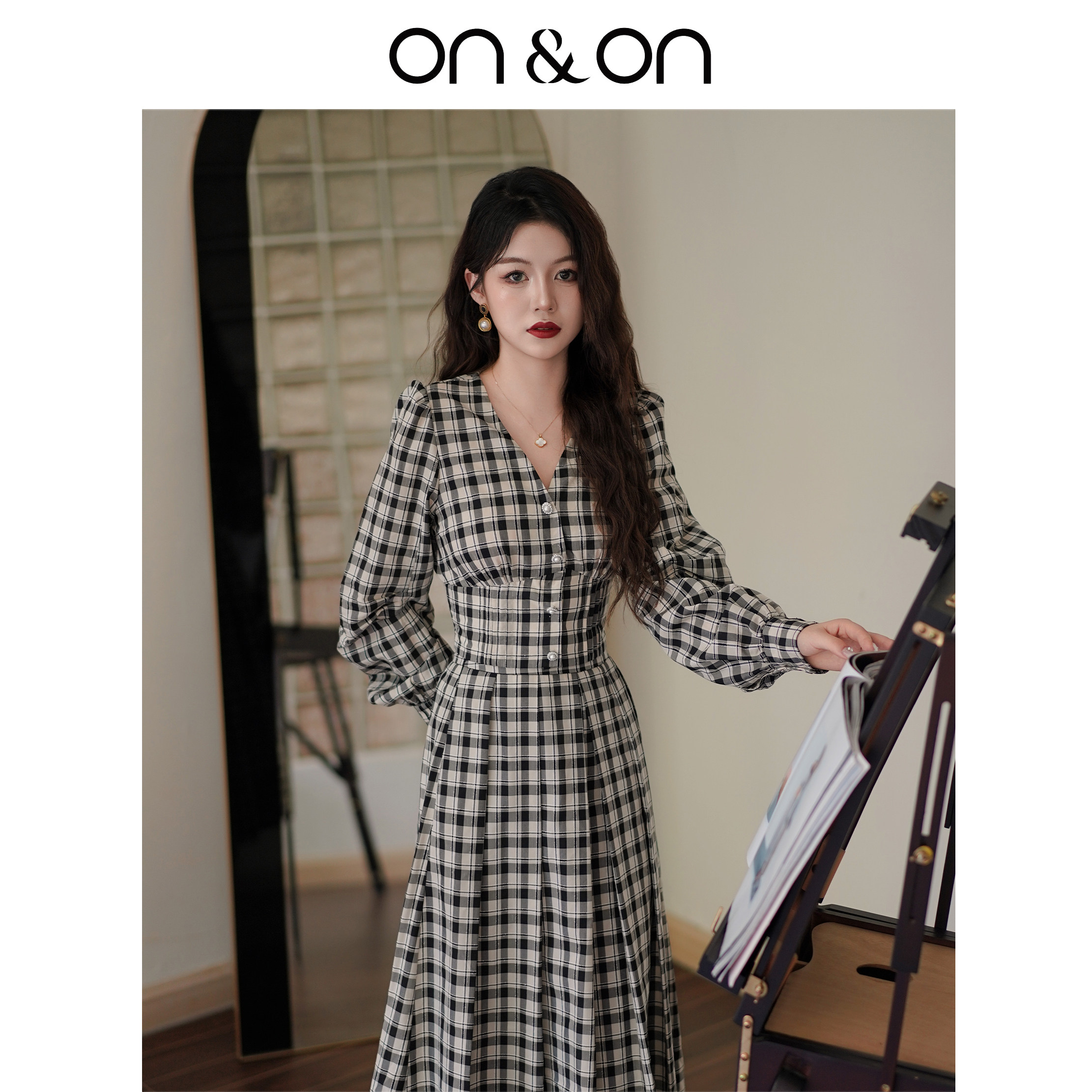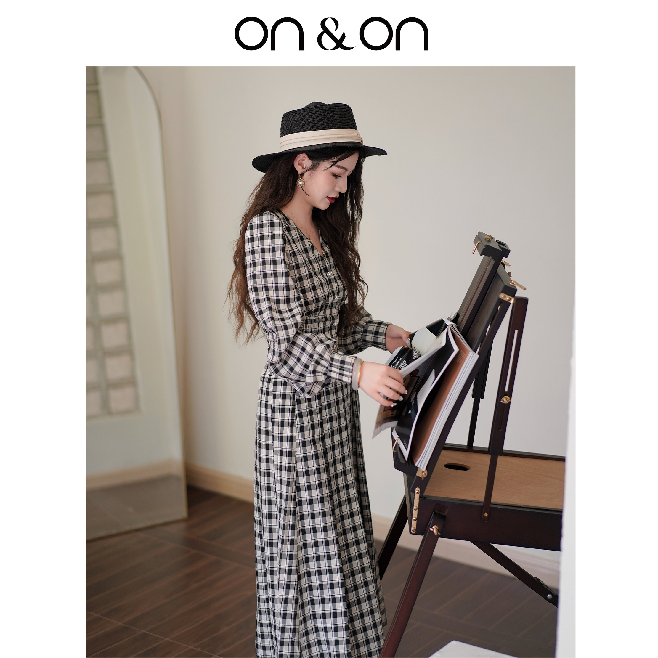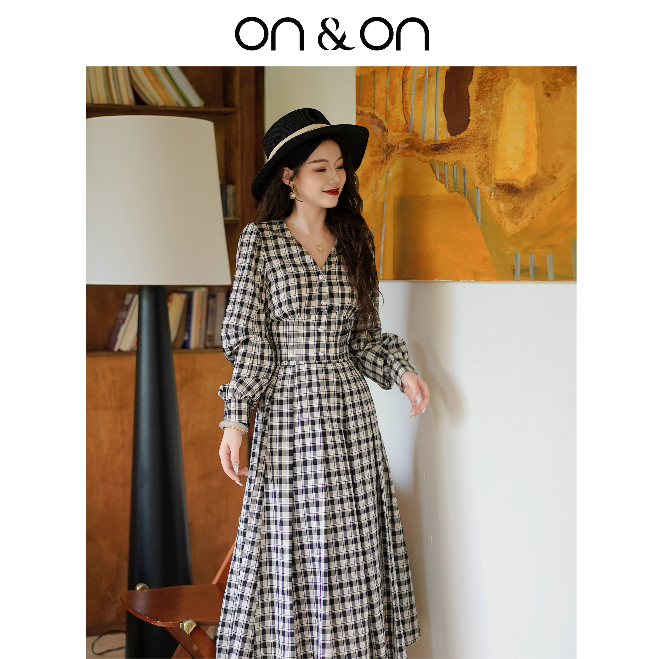 ON&ON/安乃安2025秋冬新款法式复古V领设计收腰气质格纹衫裙套装