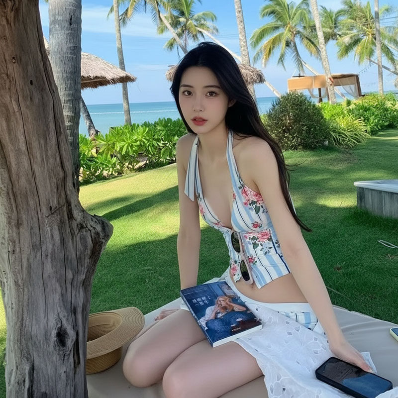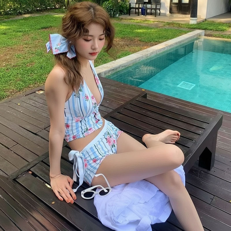 2026新款甜美少女印花挂脖系带分体泳衣性感清新泡温泉度假两件套