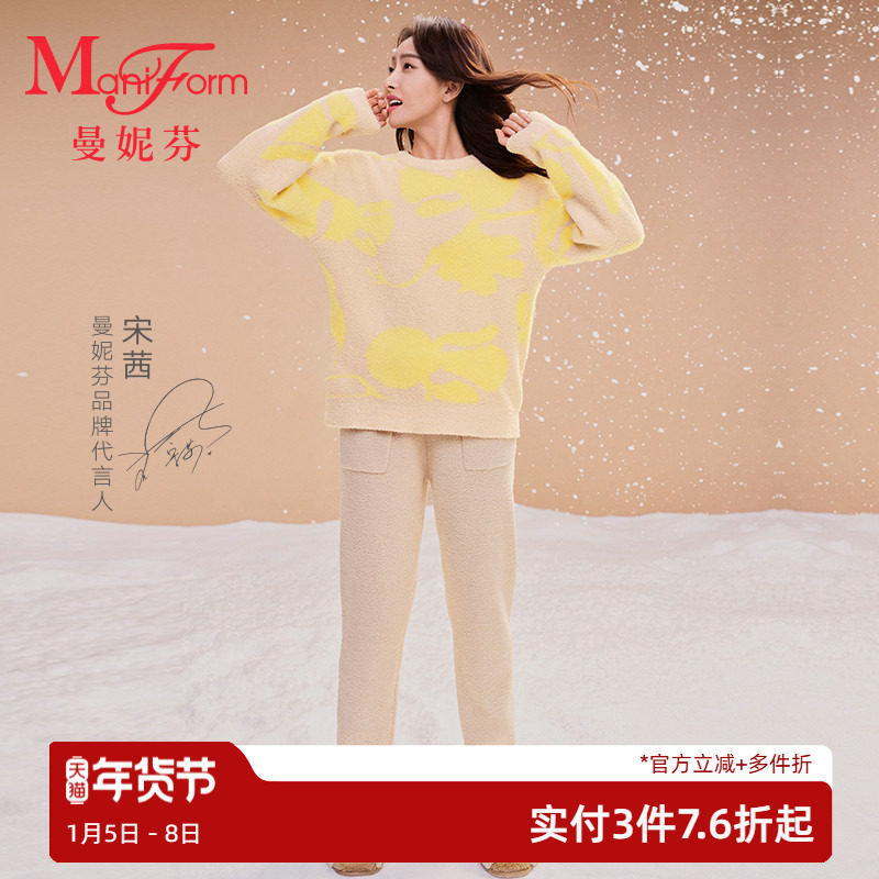 曼妮芬秋冬睡衣睡裤雪尼尔家居圆领套头长袖长裤女士套装20320660