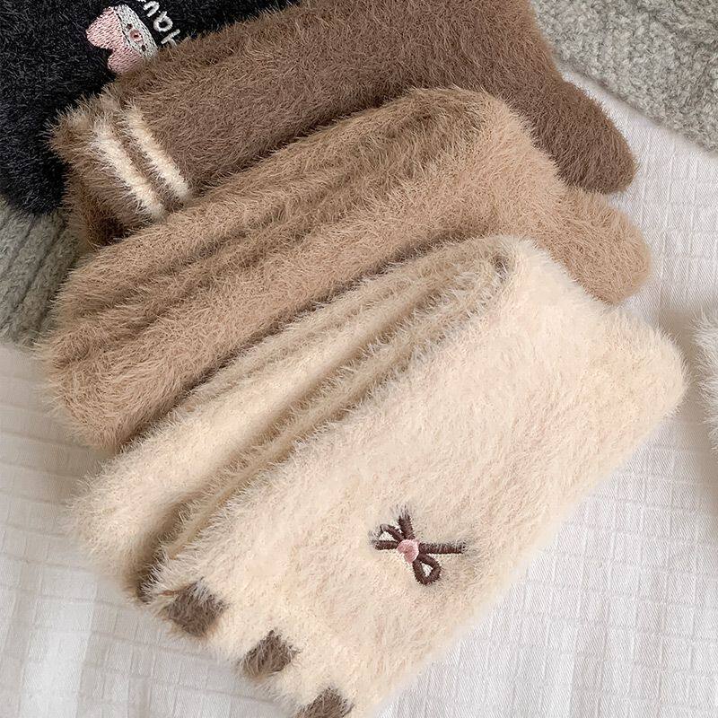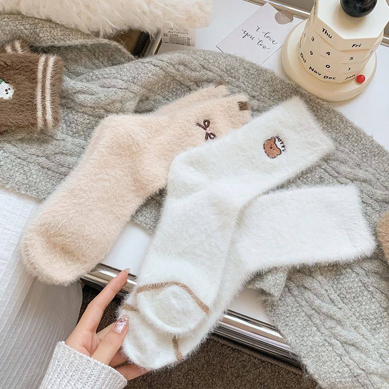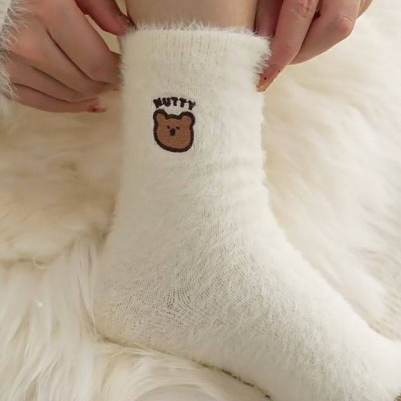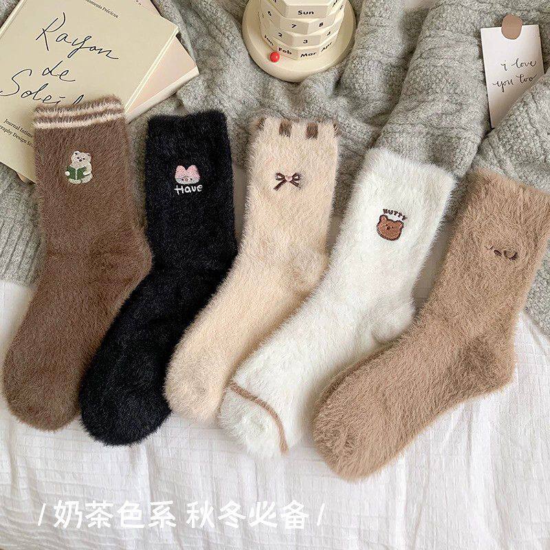 可爱百搭居家睡眠地板月子袜卡通水貂绒袜子女秋冬加厚毛绒中筒袜