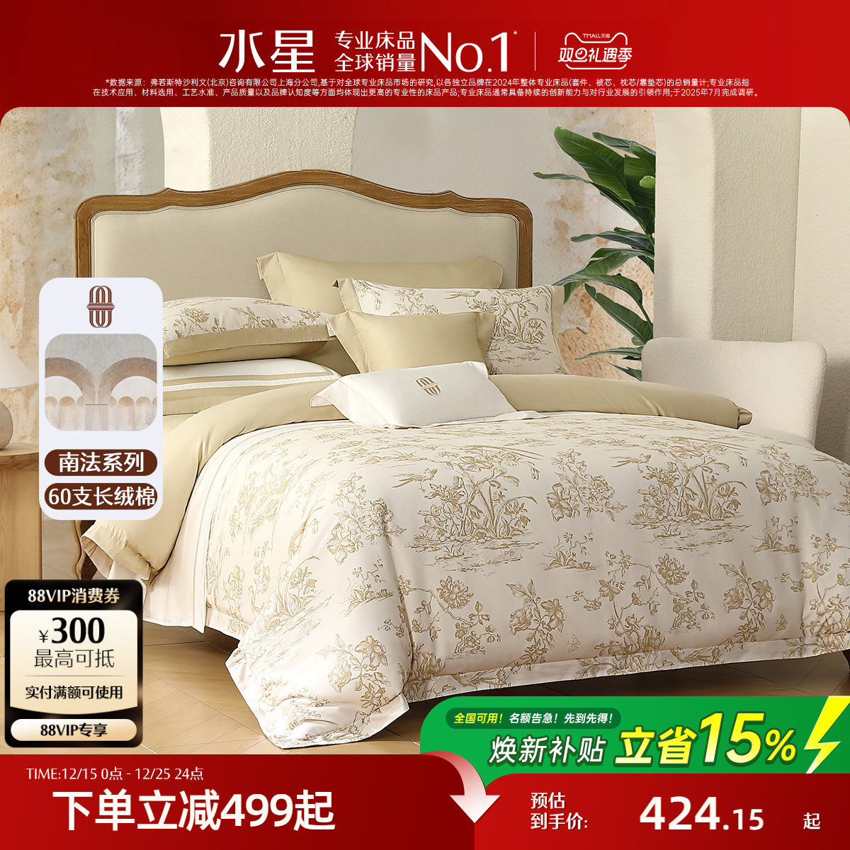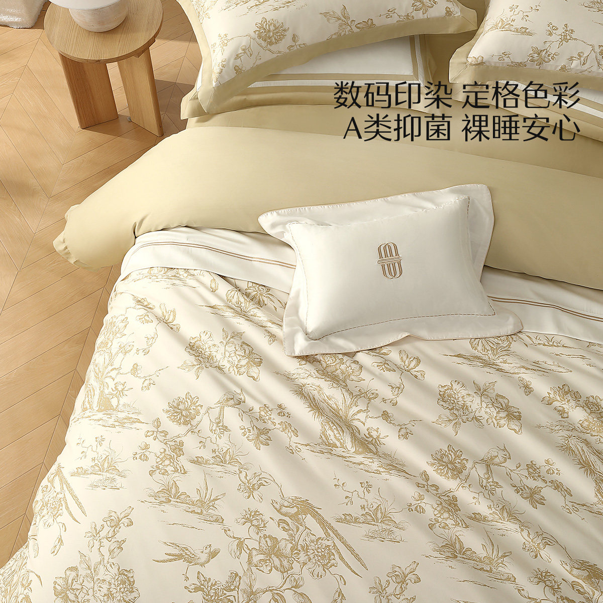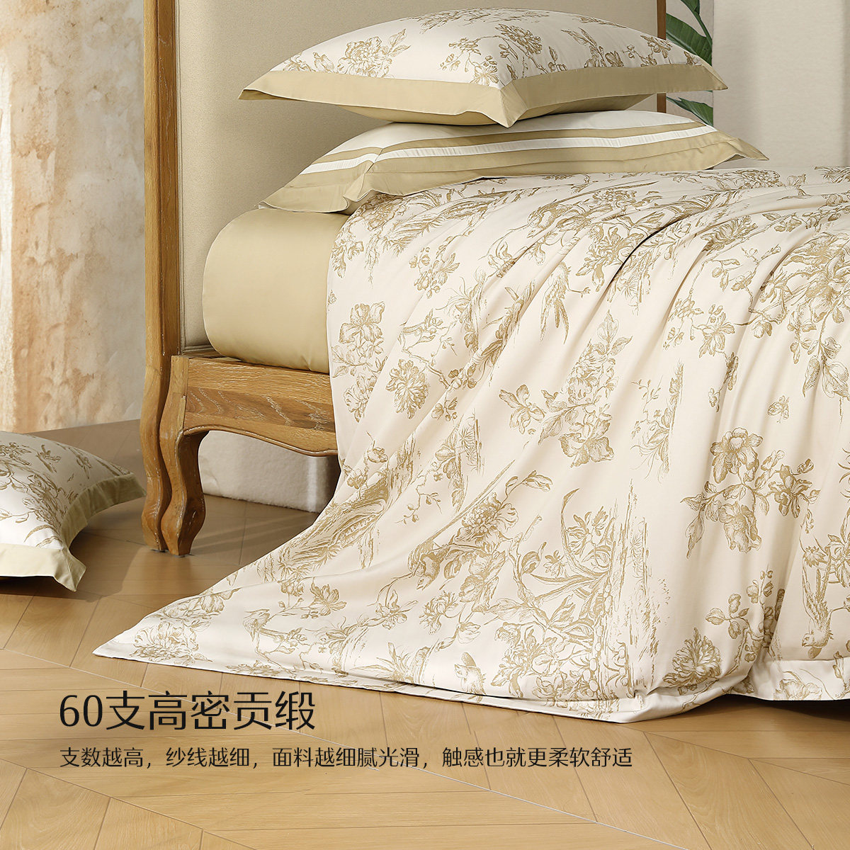 水星家纺60支长绒棉贡缎四件套抑菌轻奢套件法式印花被套床单