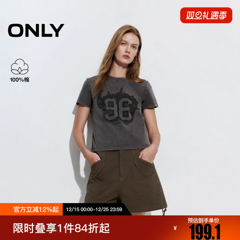 ONLY2025冬新款美式做旧磨白数字印花正肩圆领T恤女|125201021
