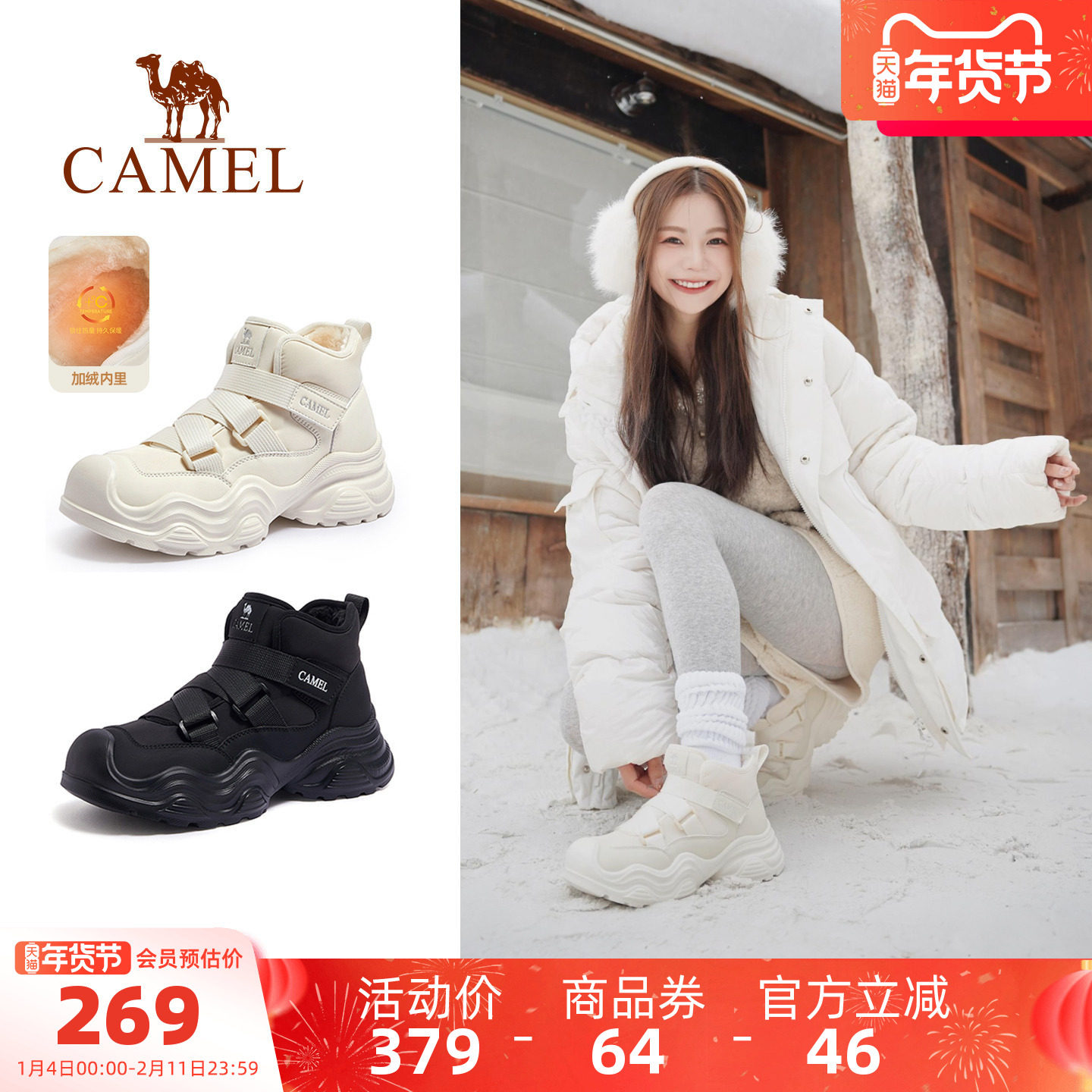 骆驼女鞋2025冬季新款厚底丑萌雪地靴女款加绒保暖棉鞋户外登山鞋