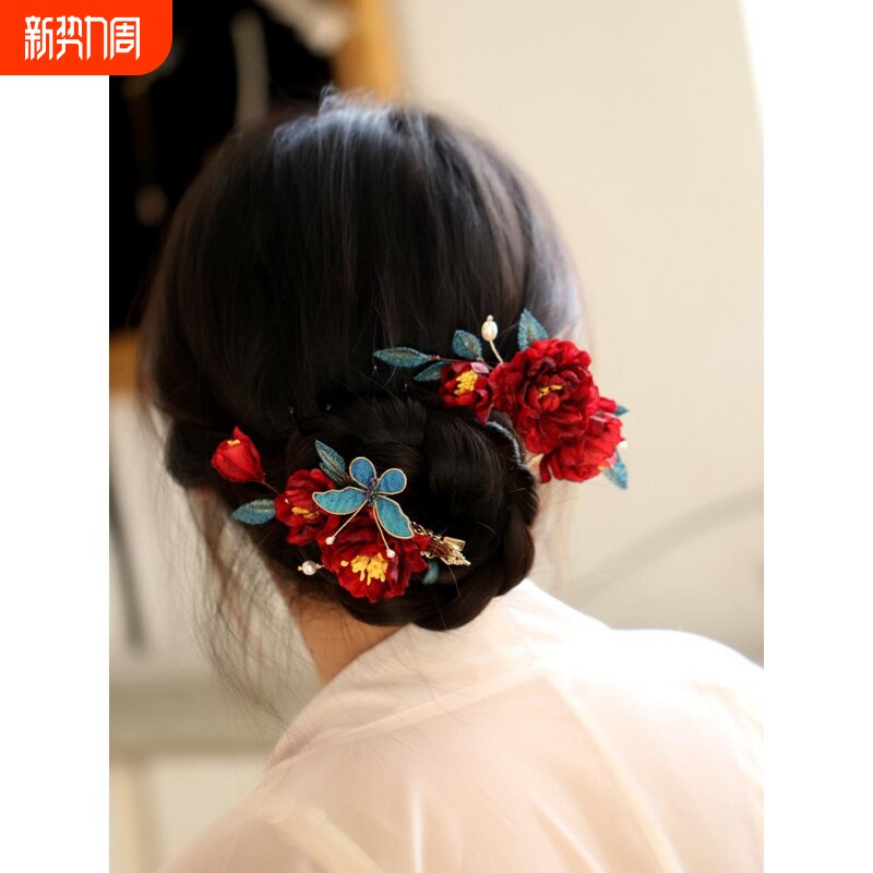 蝴蝶发夹红色山茶花低丸子头旗袍古风配敬酒服中式簪子马面裙发饰