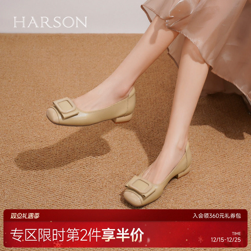 哈森粗跟单鞋女秋季新款休闲软面一脚蹬女鞋奶奶鞋HWL240106