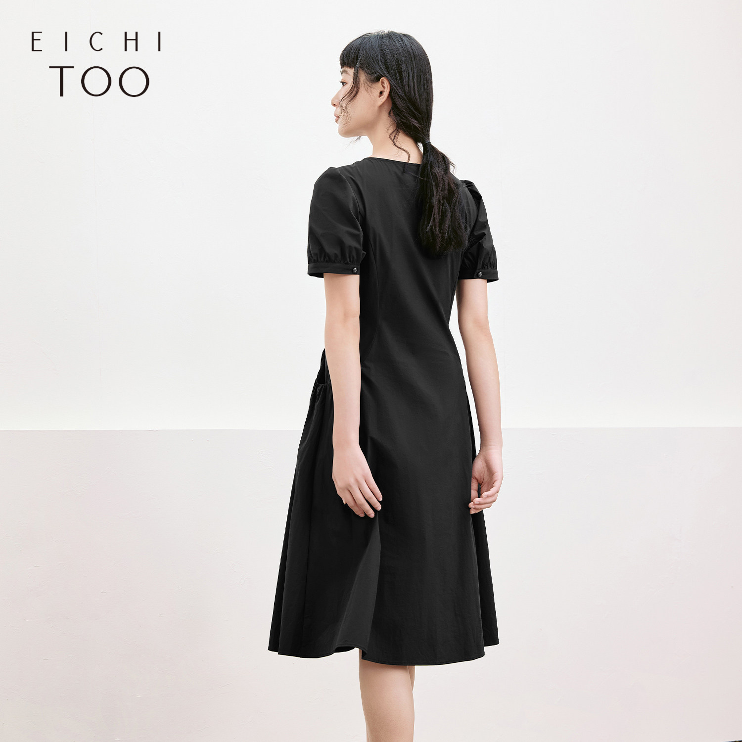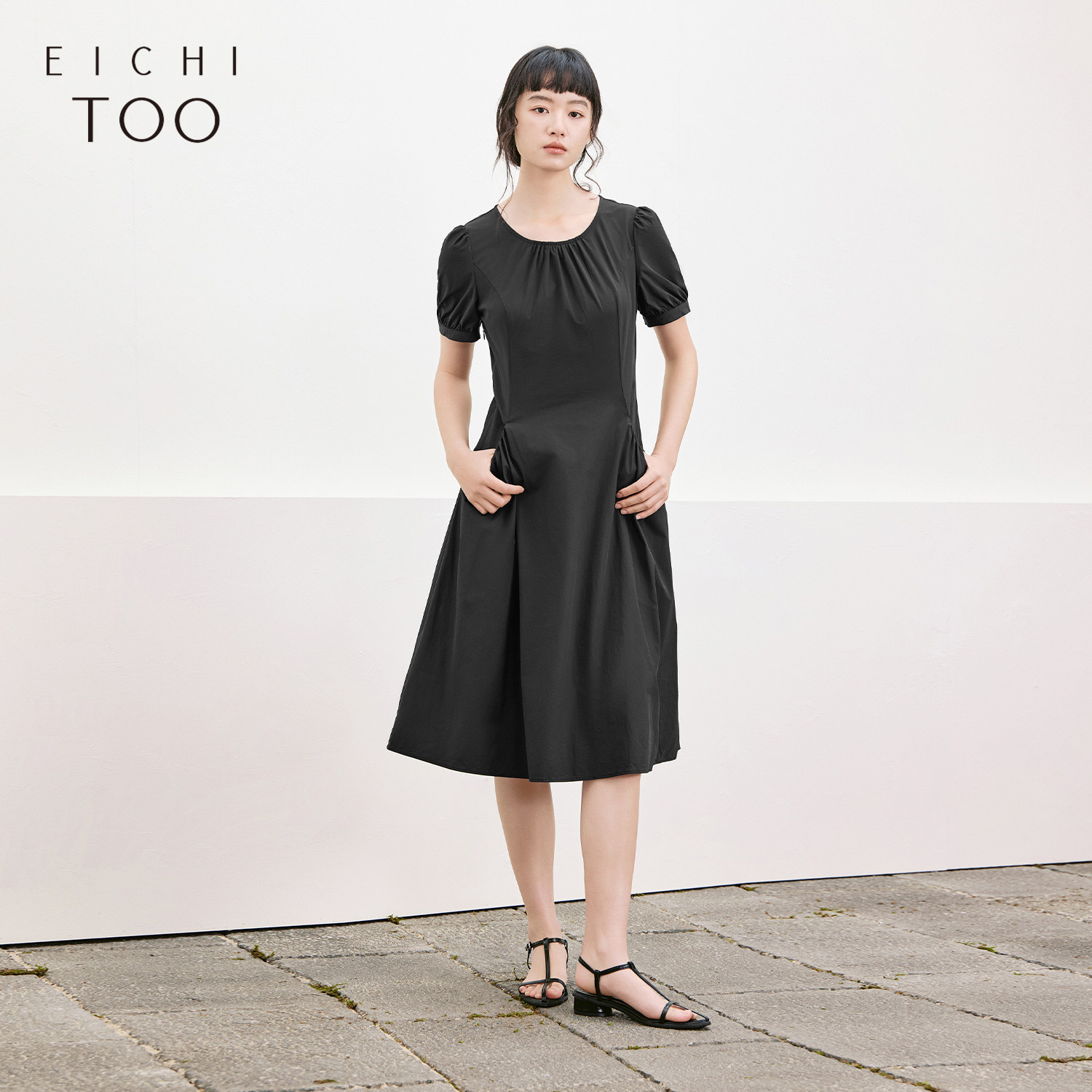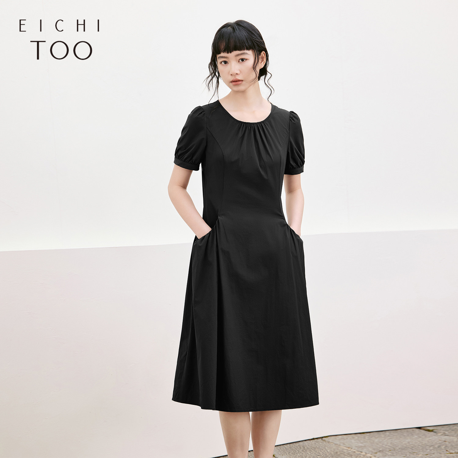 【热销补货】欧时力 褶皱短袖连衣裙女2026春新款收腰显瘦小黑裙