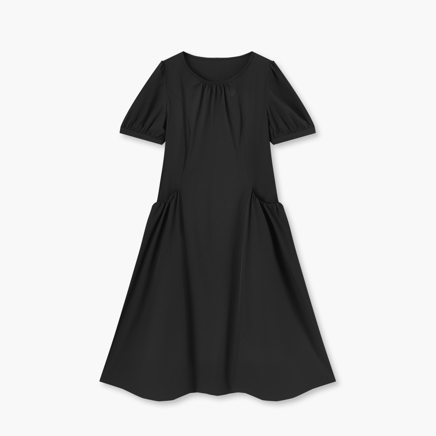 爱居兔时尚小黑裙女夏季新款收腰显瘦褶皱大口袋短袖连衣裙