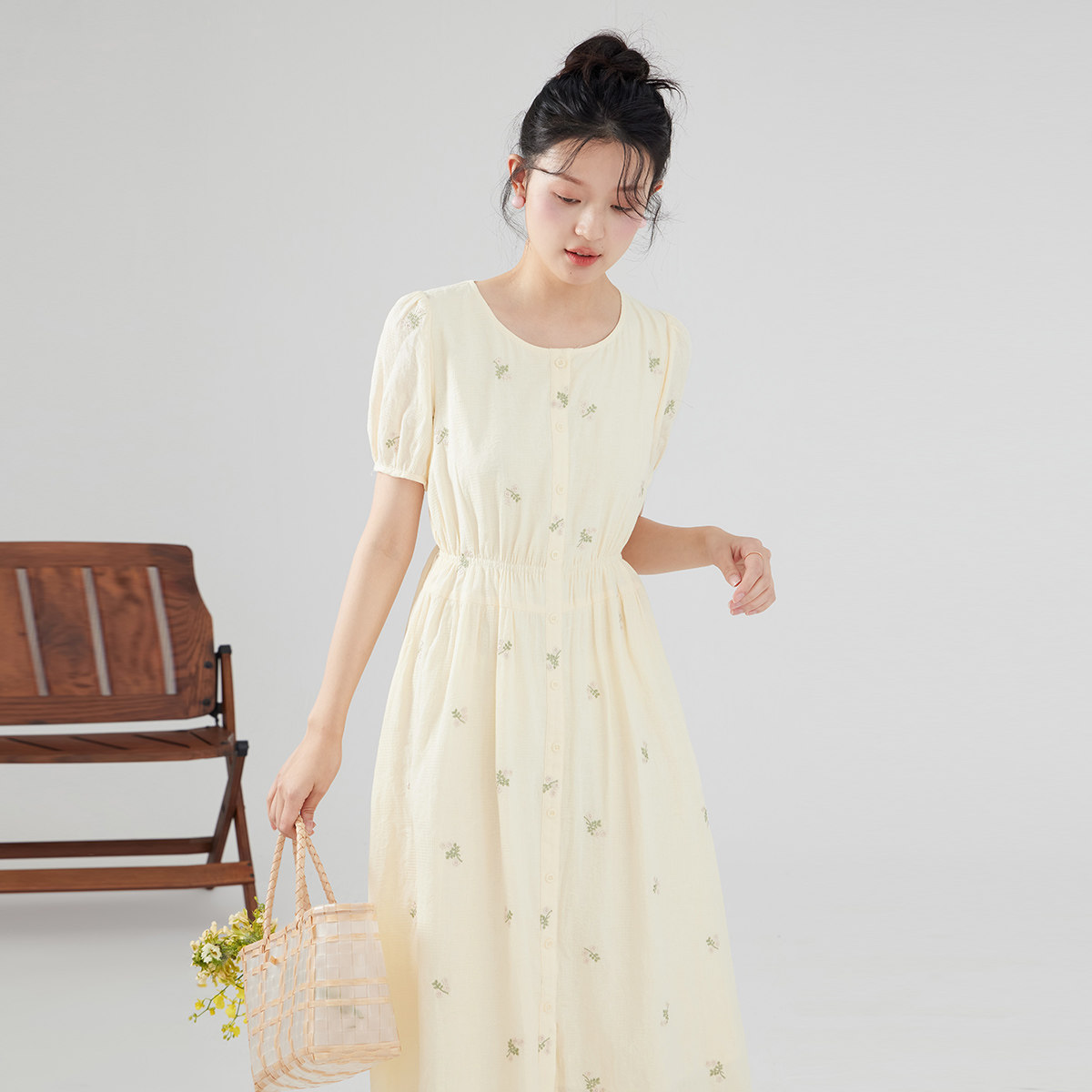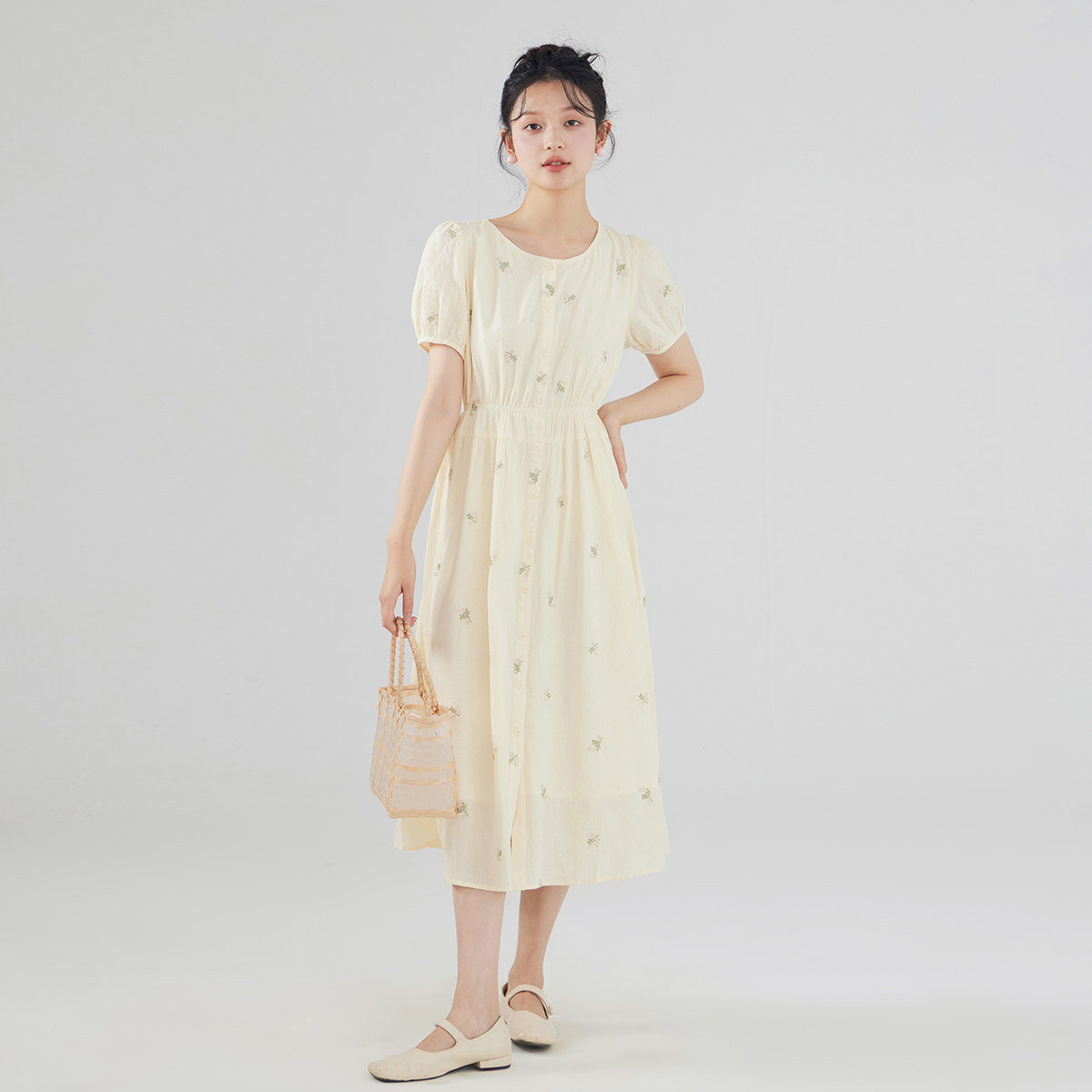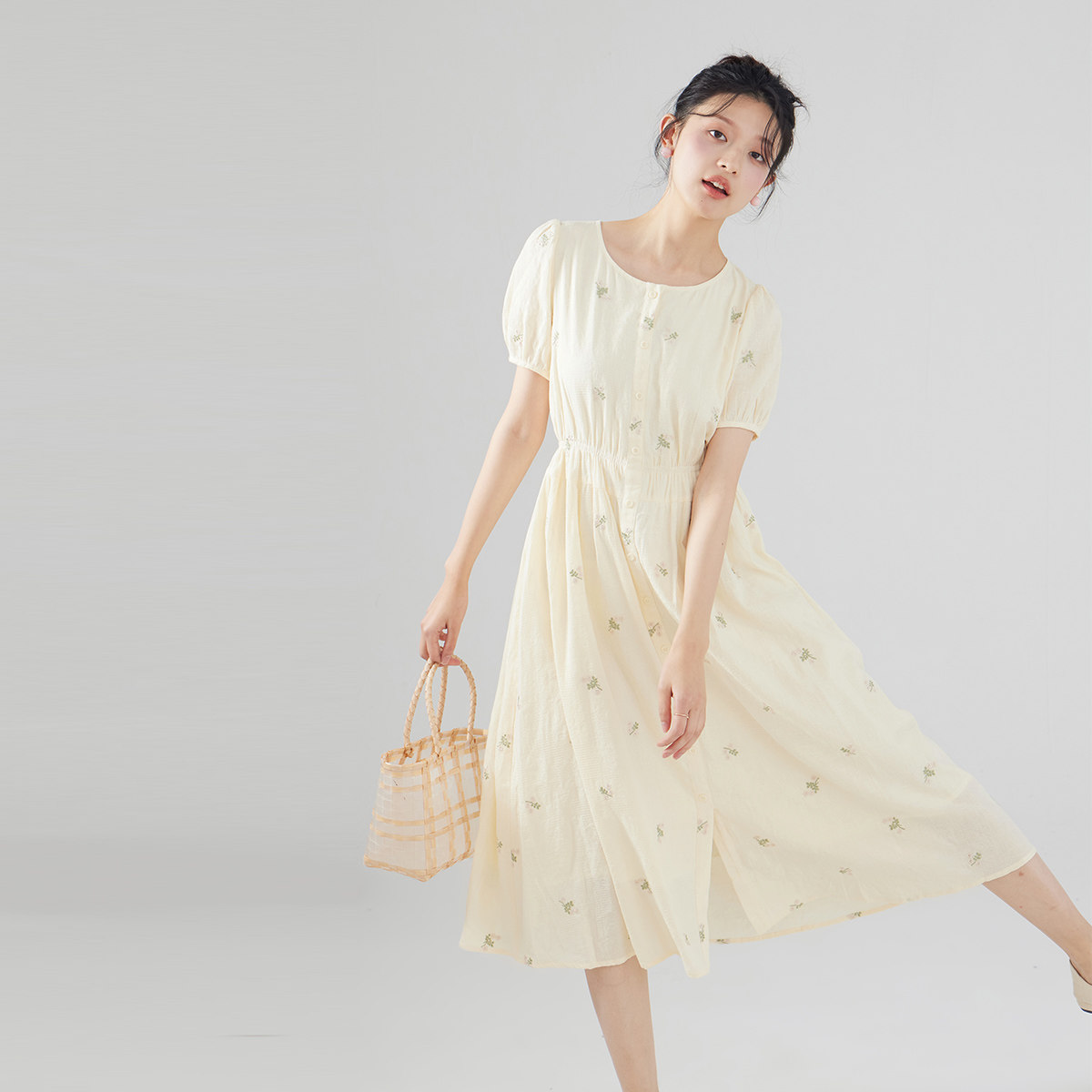 one more圆领泡泡袖连衣裙女2025新款高级感刺绣法式度假碎花裙子