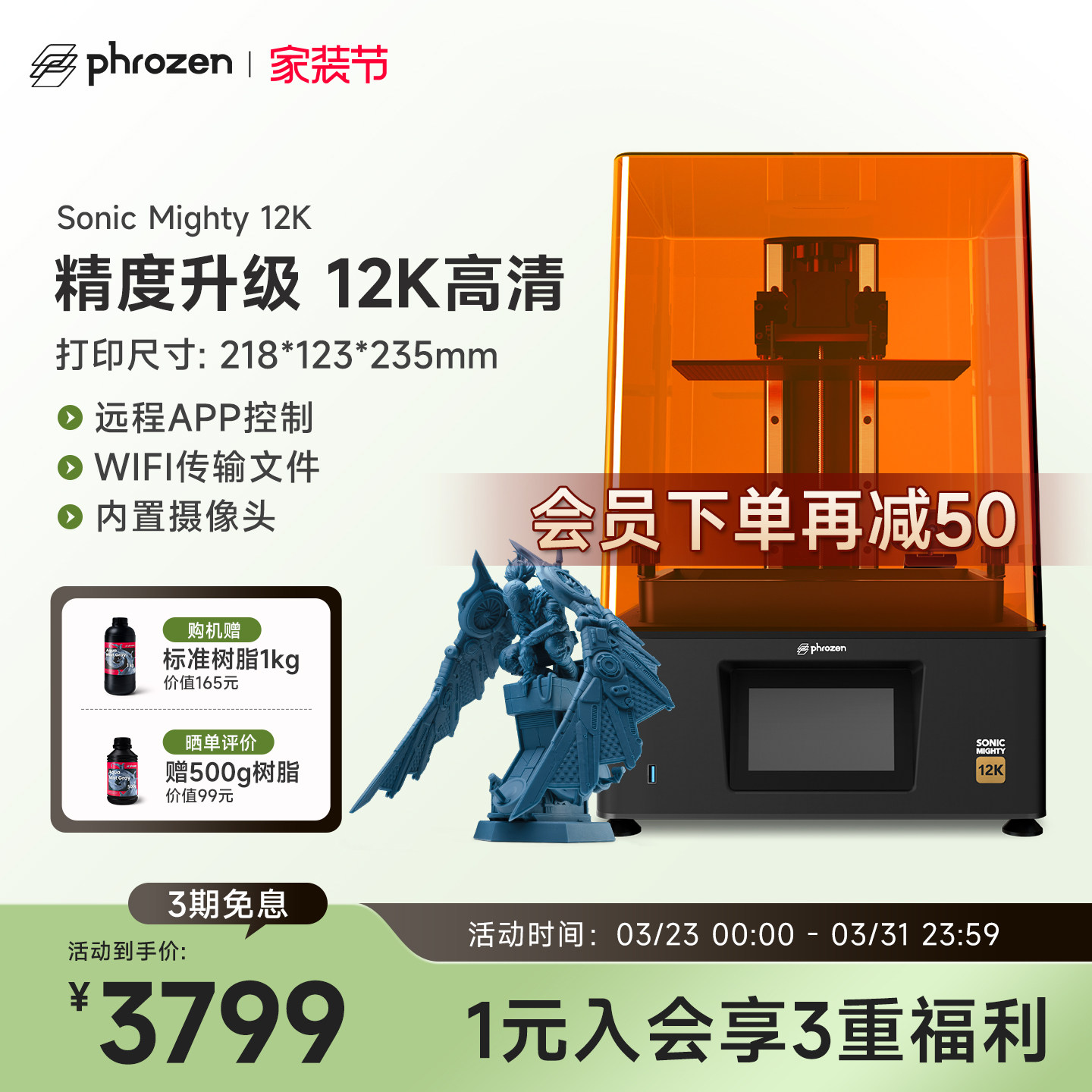 普罗森 Sonic Mighty 8K光固化3d打印机微缩10.1英吋8k黑白屏桌面级28微米高精度手办模型家用3d打印机