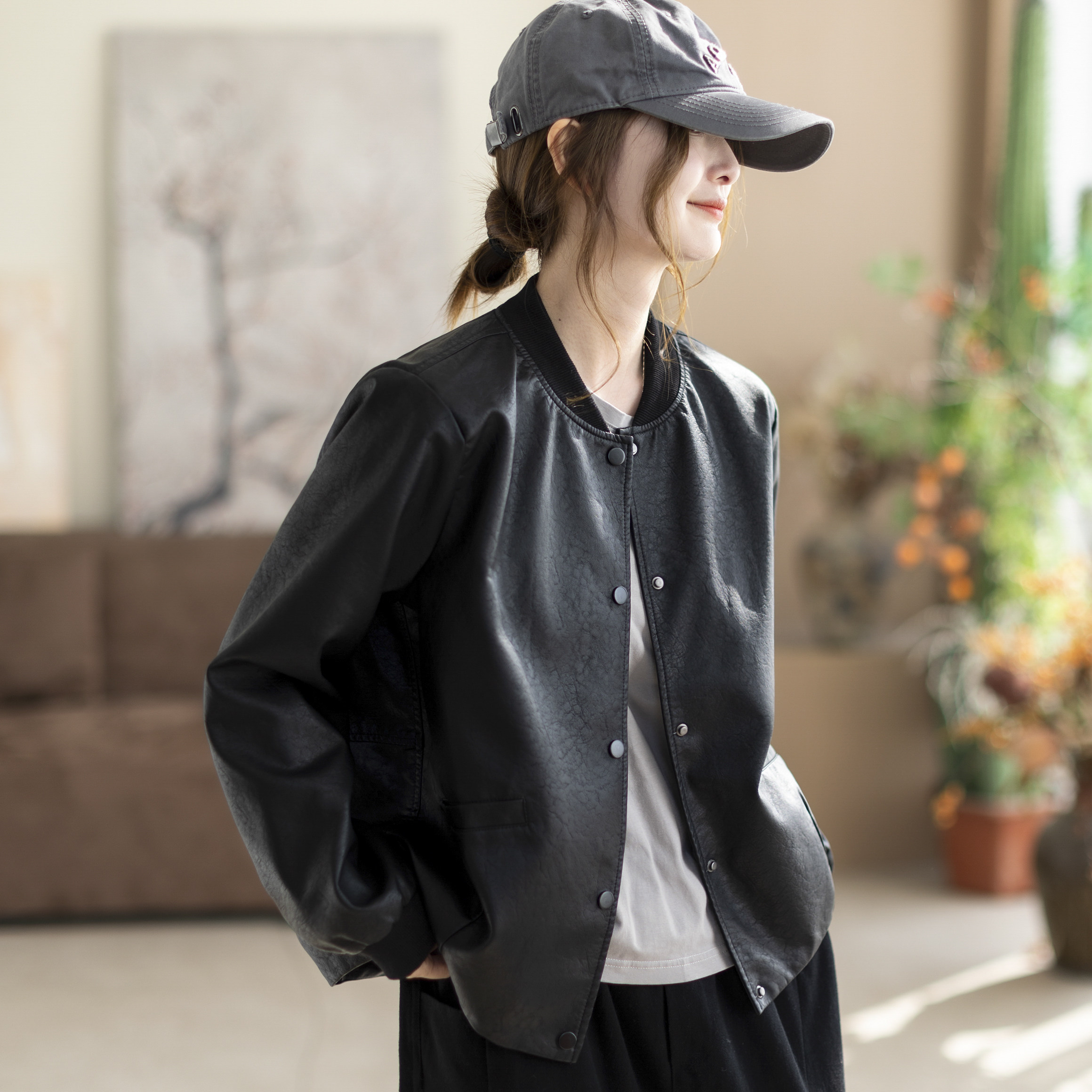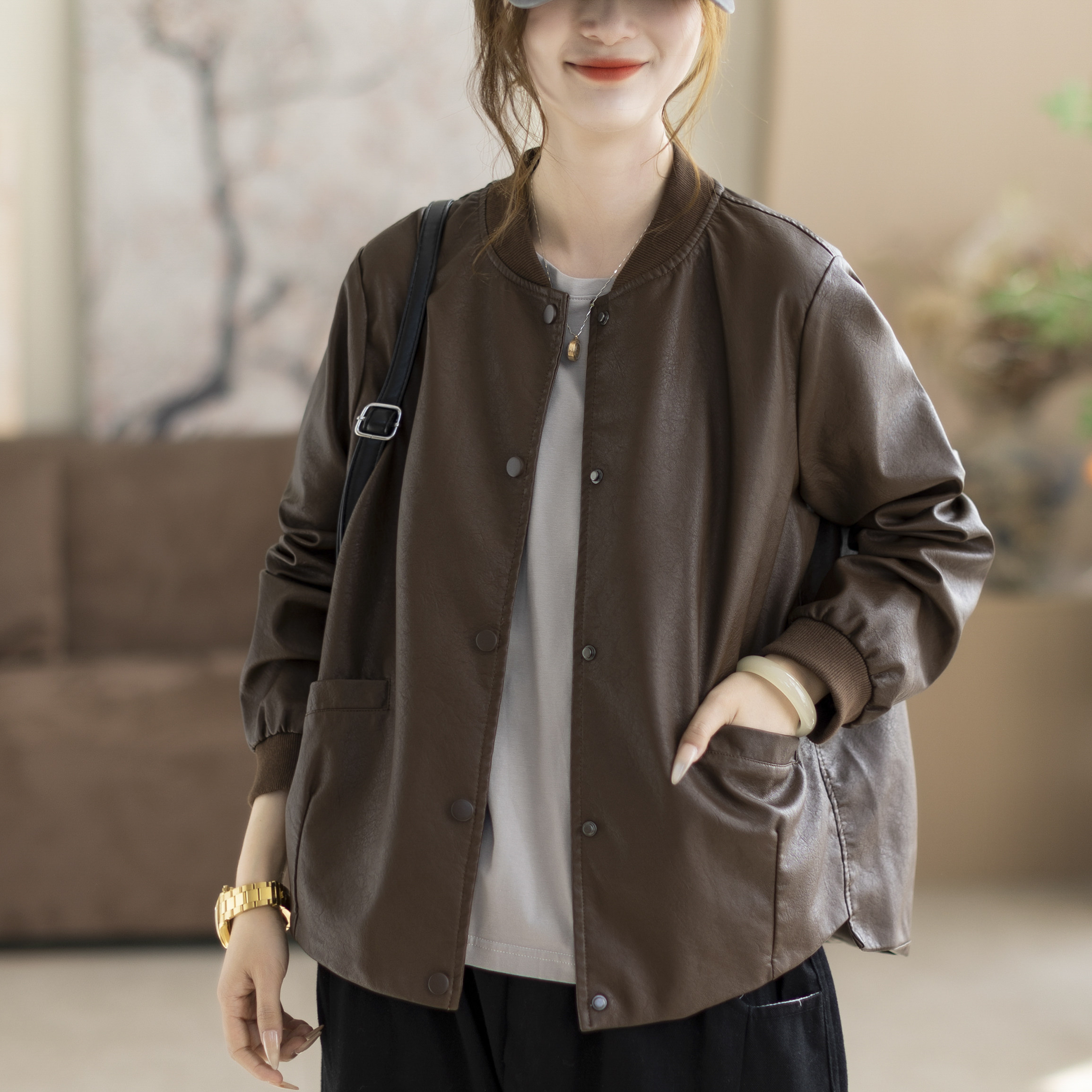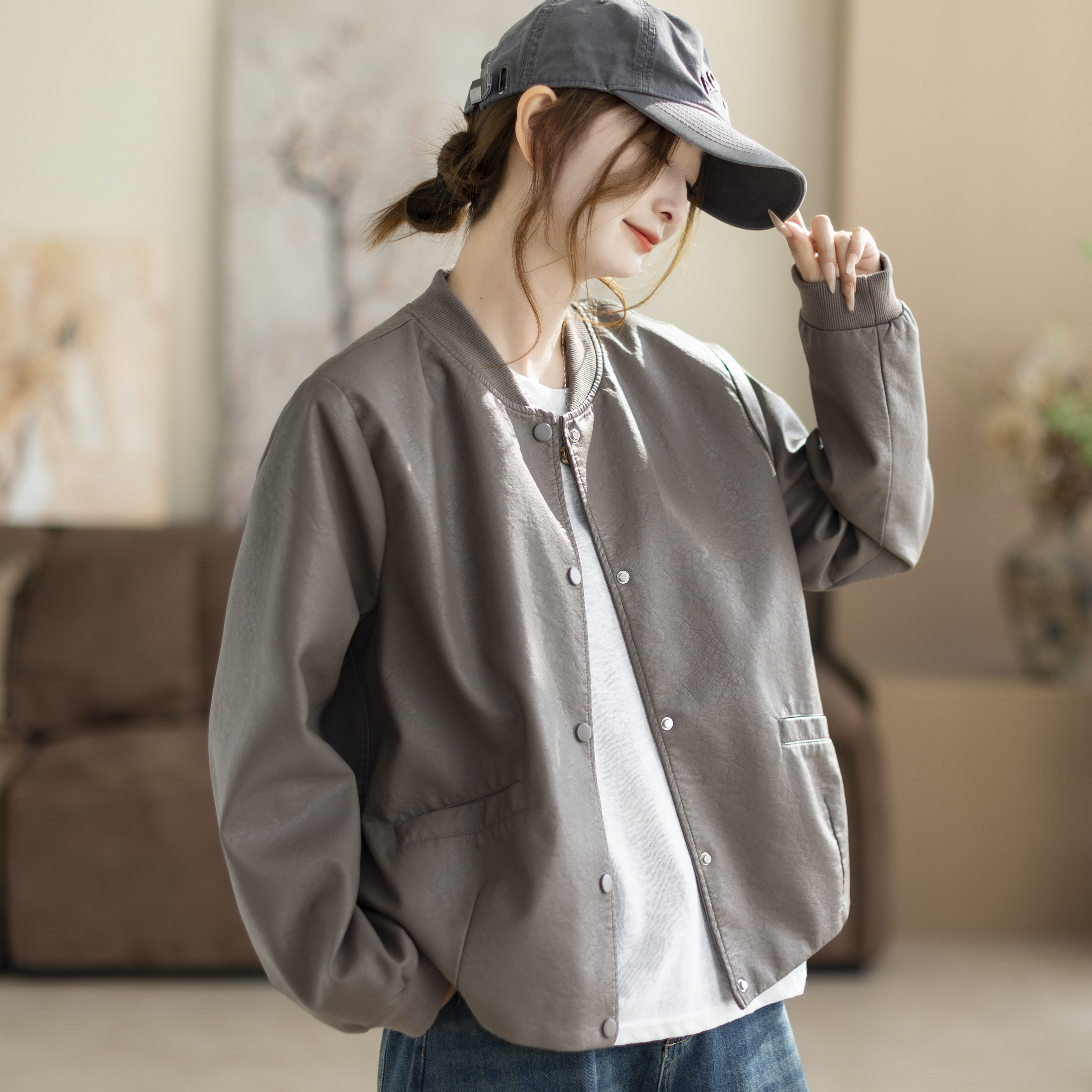 咖咪羽皮衣女春秋新款长袖女士休闲PU皮短款圆领文艺纯色女装上衣