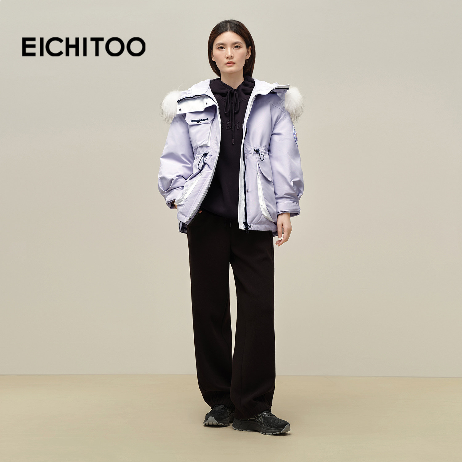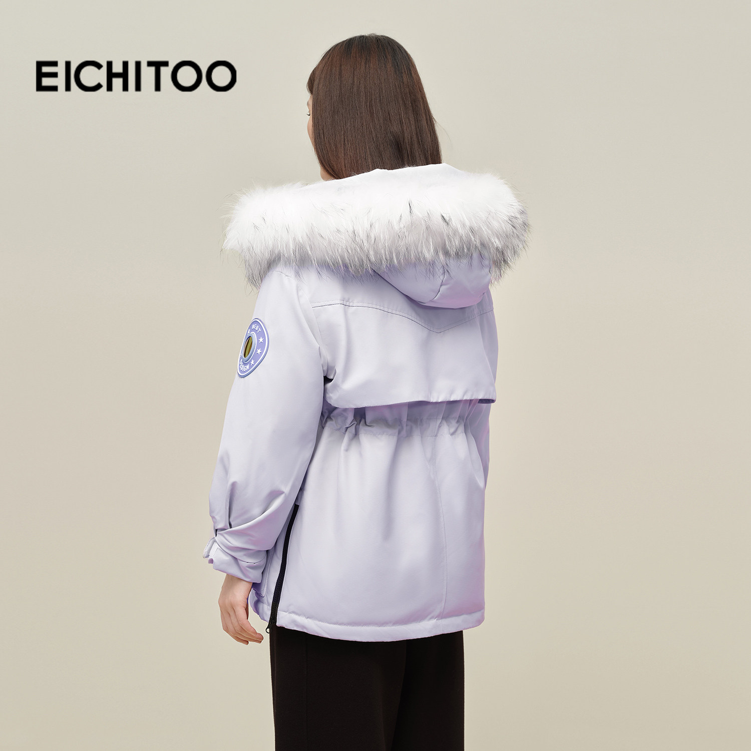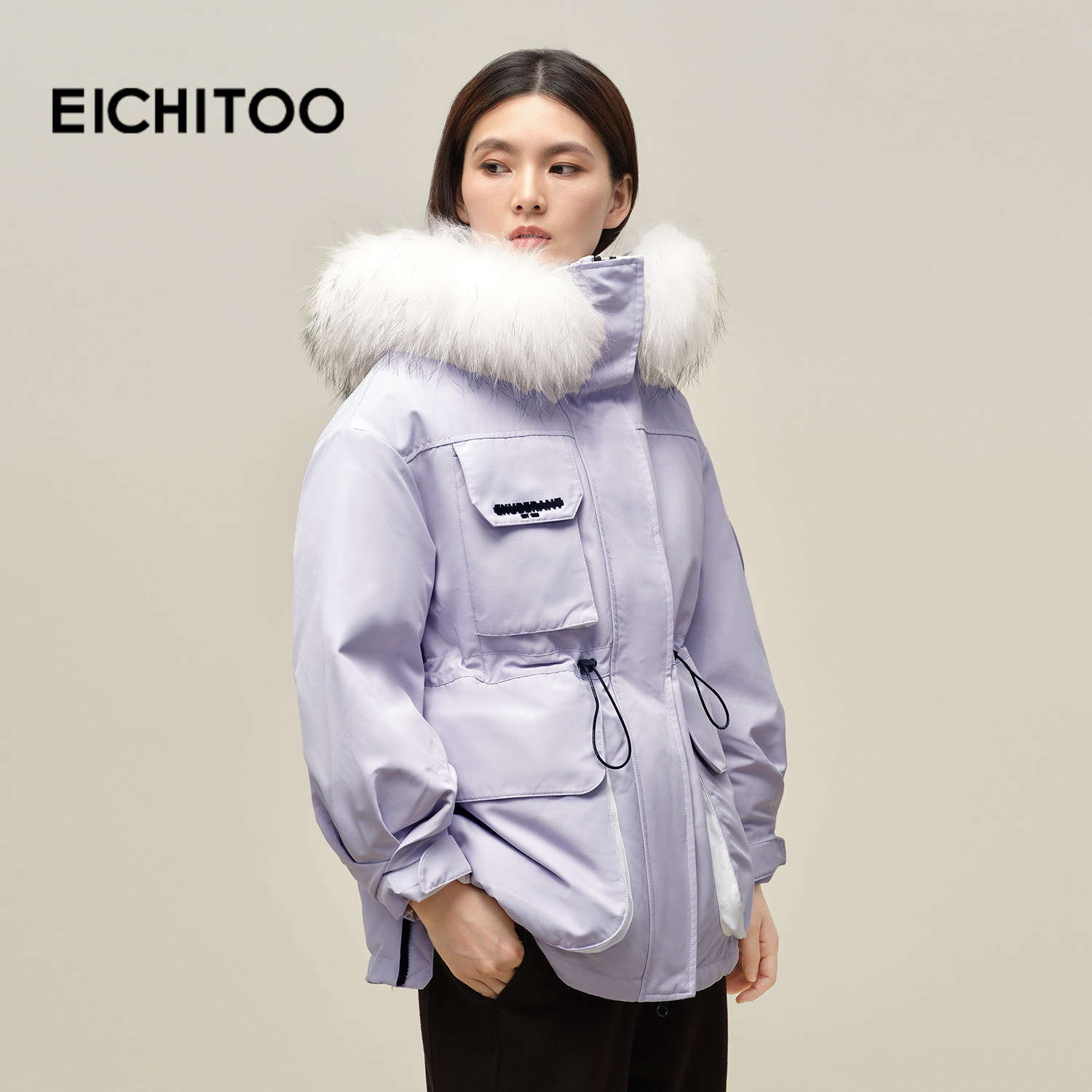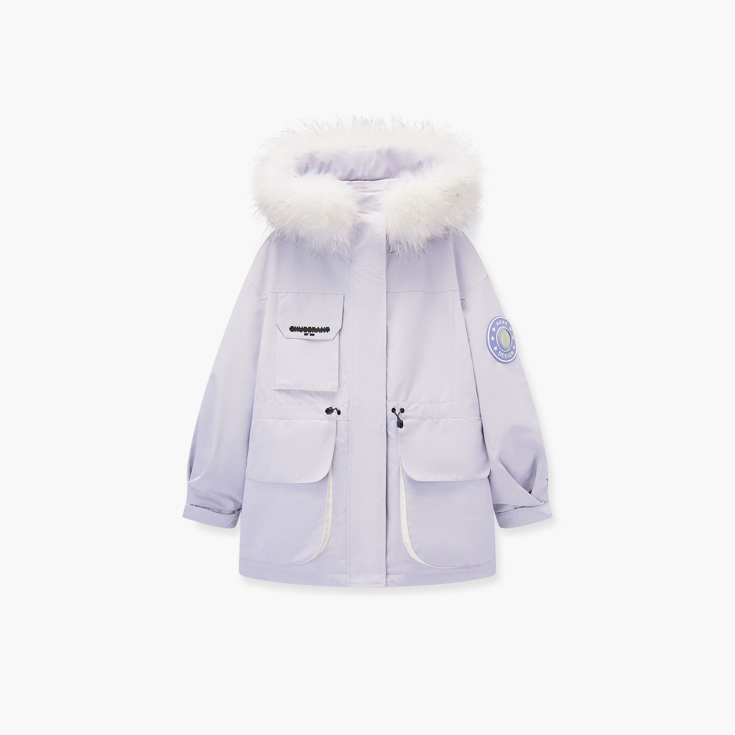 爱居兔紫色带毛领连帽工装羽绒服女2025年冬季新款户外防风派克服