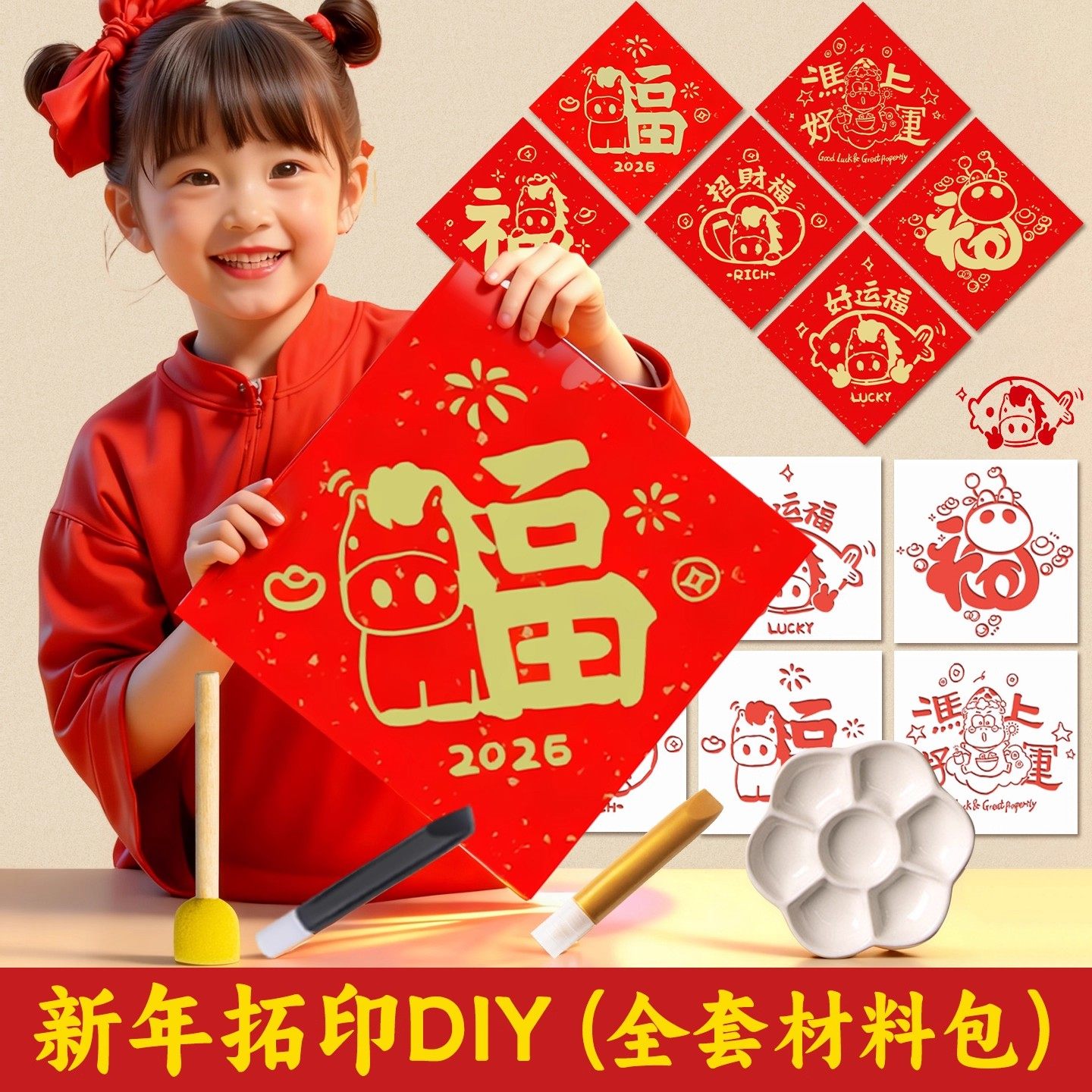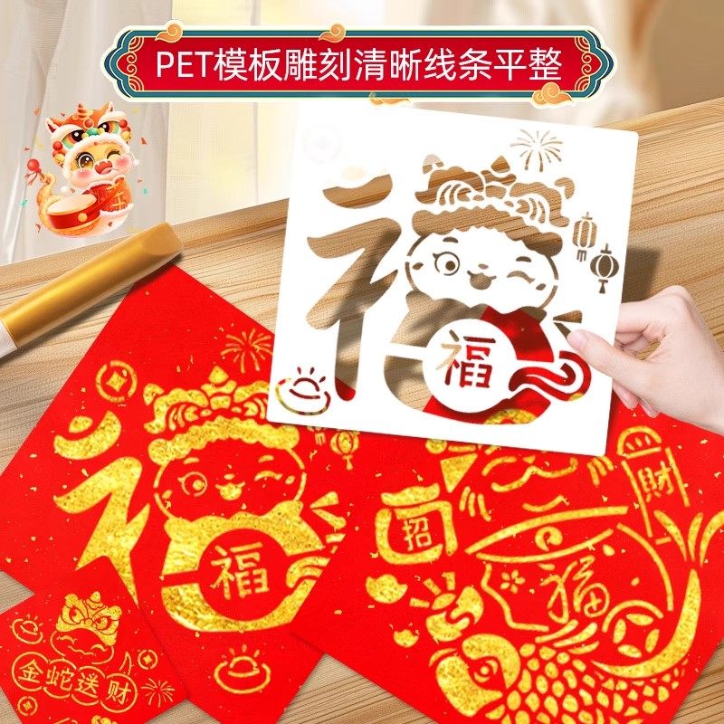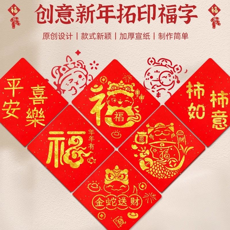 2026马年福字拓印材料包幼儿园元旦6儿童手工diy拓印模板工具套装新年镂空福字红纸拓印手工涂鸦春节福字印刷