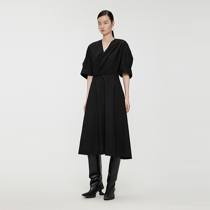 【热销补货】欧时力 褶皱短袖连衣裙女2026春新款收腰显瘦小黑裙