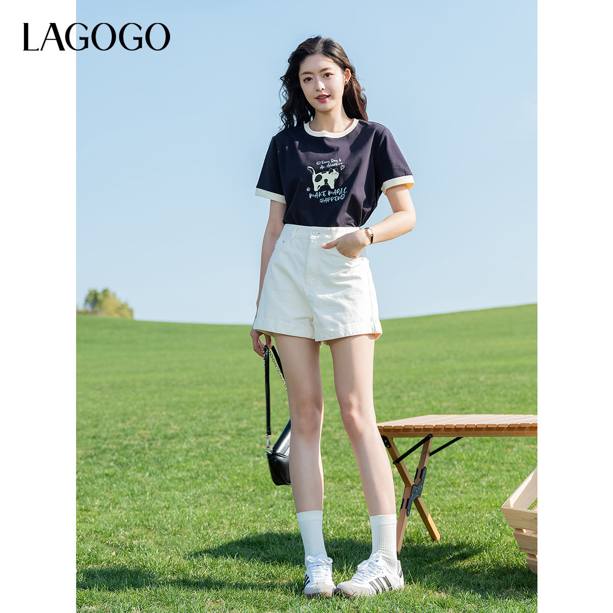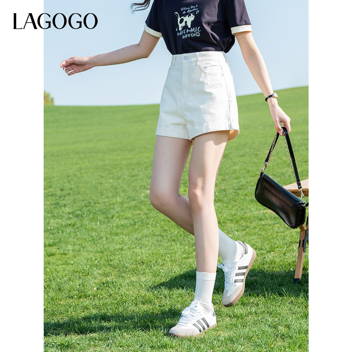 LAGOGO米白色翻边牛仔裤短裤女拉谷谷2025年夏季新款纯棉显高裤子