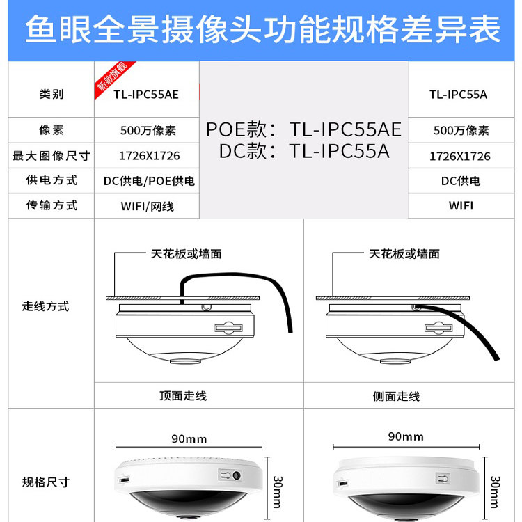 TP-LINK 360度全景500万网络鱼眼摄像头无线wifi监控器 手机远程
