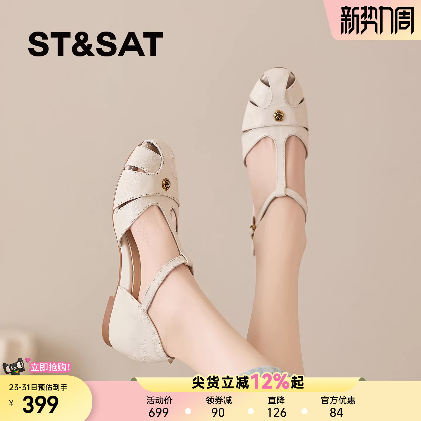 星期六法式包头凉鞋女夏巨好看米白色镂空山茶花配裙子平底单鞋子