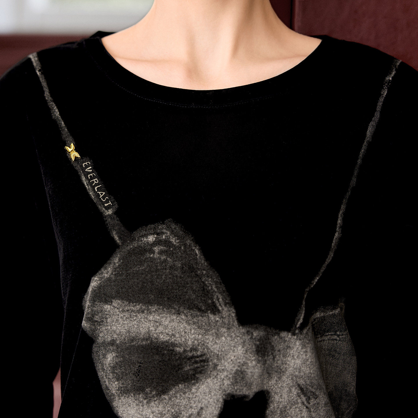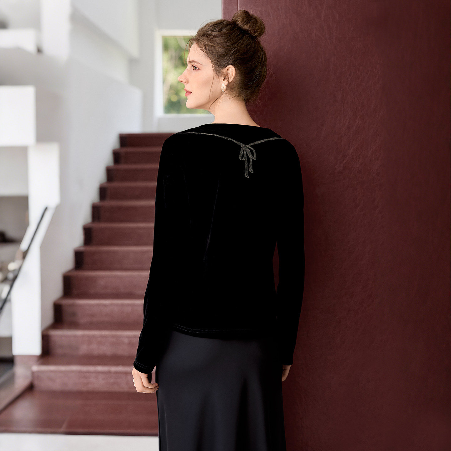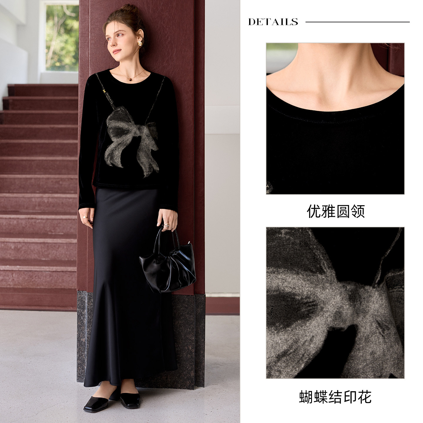 她池修身打底衫2025秋装新款女装设计感蝴蝶结印花圆领套头上衣