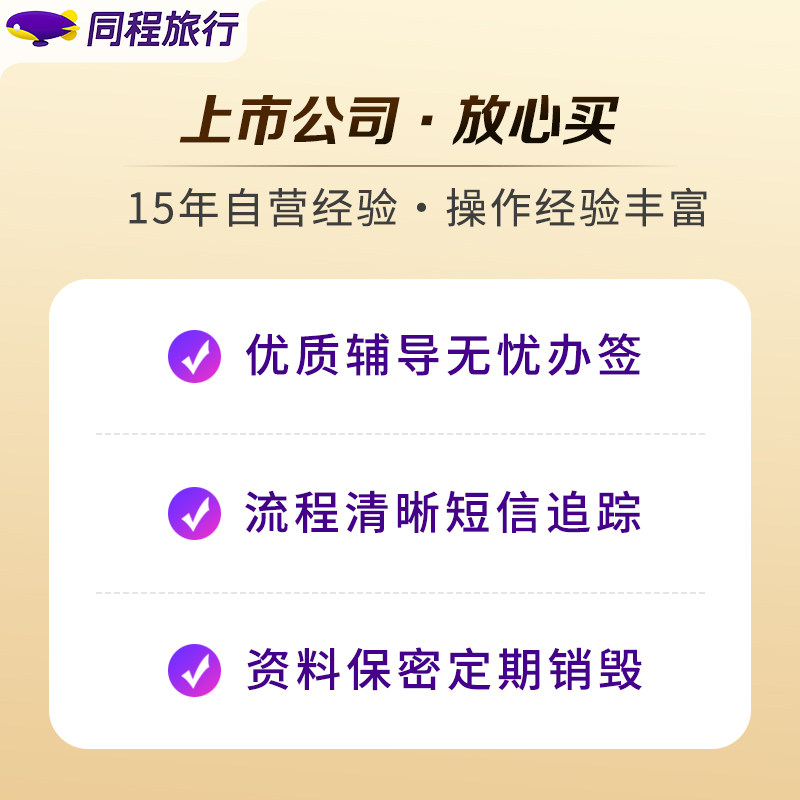【品牌保障】上市公司,同程官方店铺 【放心优选】多种套餐可选择,方便办理 【优质服务】专业团队办签,高出签率 【流程透明】进度实时更新,安心省心