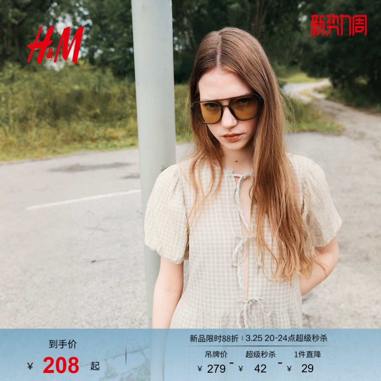 HM女装连衣裙春季美式甜心风泡泡袖喇叭形系带前襟连衣裙1295719